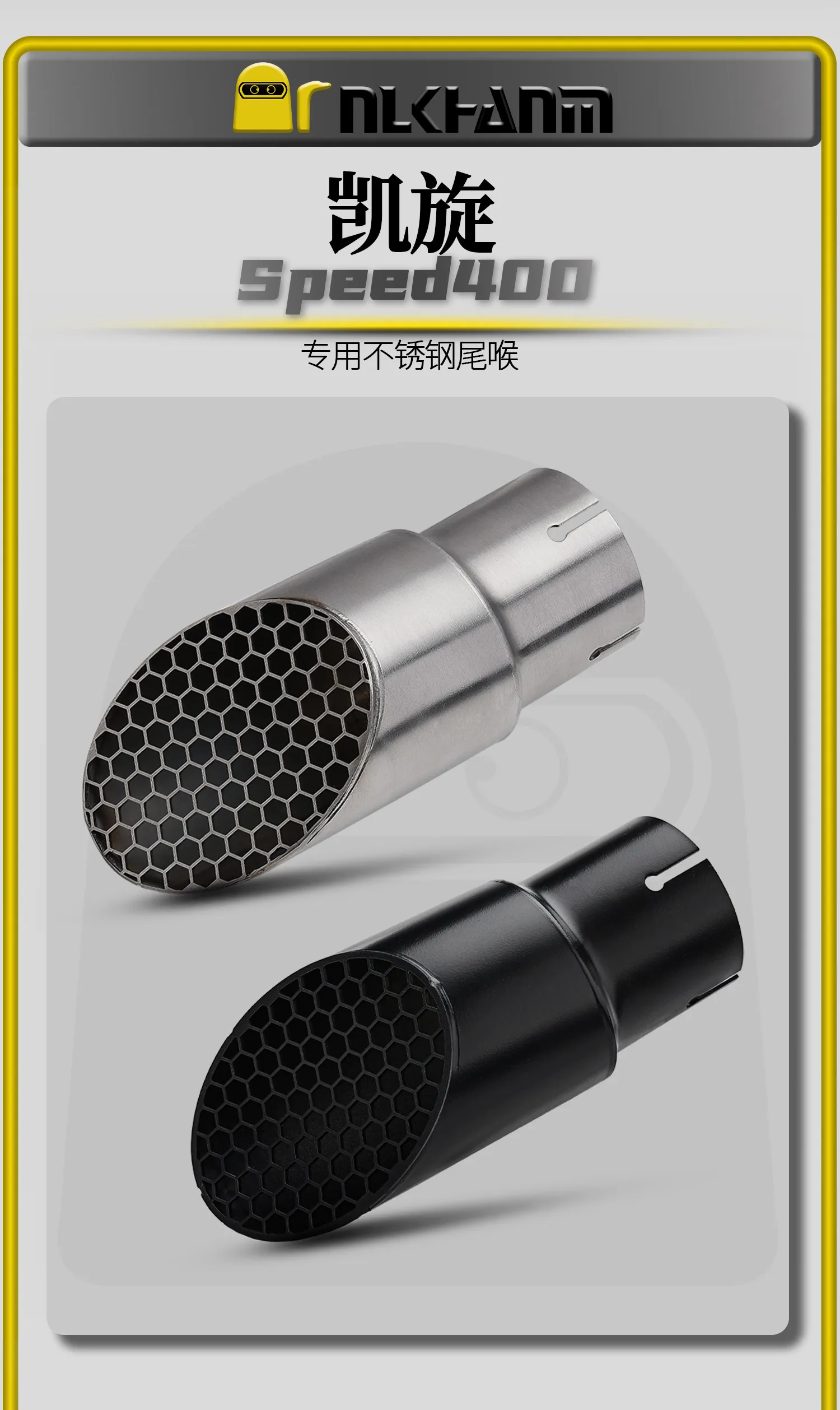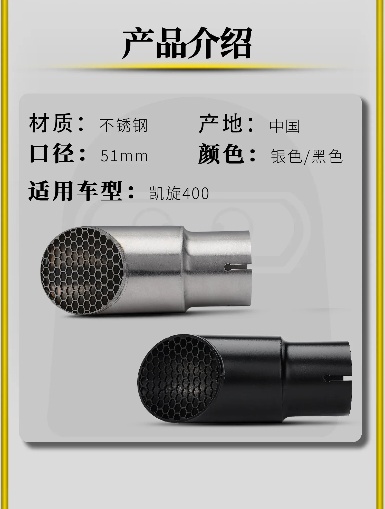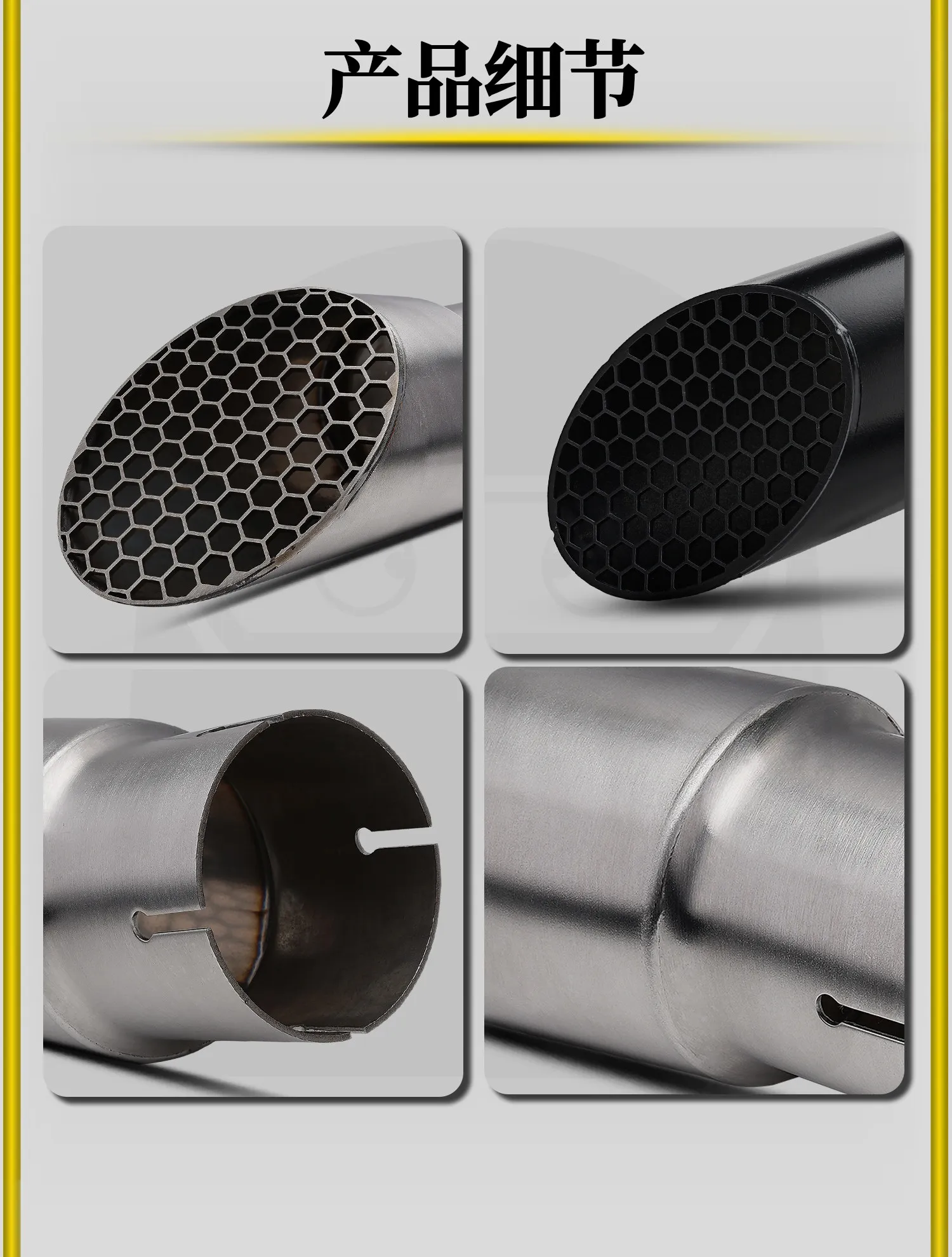 Material y apariencia: el acero inoxidable es resistente a la corrosión y al calor, y ofrece dos opciones de color: plateado y negro.El diseño del tubo de escape en forma de panal mejora el atractivo visual;