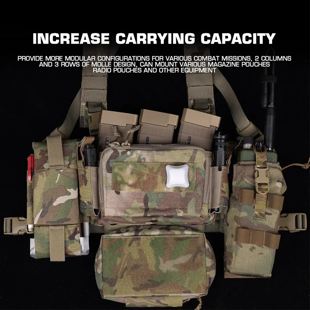 ※ Proporciona configuraciones más modulares para misiones de combate. 2 columnas y tres filas de diseño Molle. Puede montar varias bolsas de revistas, bolsas de radio y otros equipos.