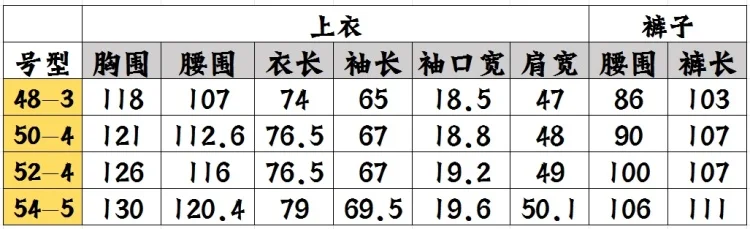48-3: circunferencia del pecho 118 cm, circunferencia de la cintura 107 cm, longitud de la prenda 74 cm, longitud de la manga 65 cm, ancho de apertura de la manga 18,5 cm, ancho de hombros 47 cm, largo del pantalón 103 cm, circunferencia de la cintura 86 cm