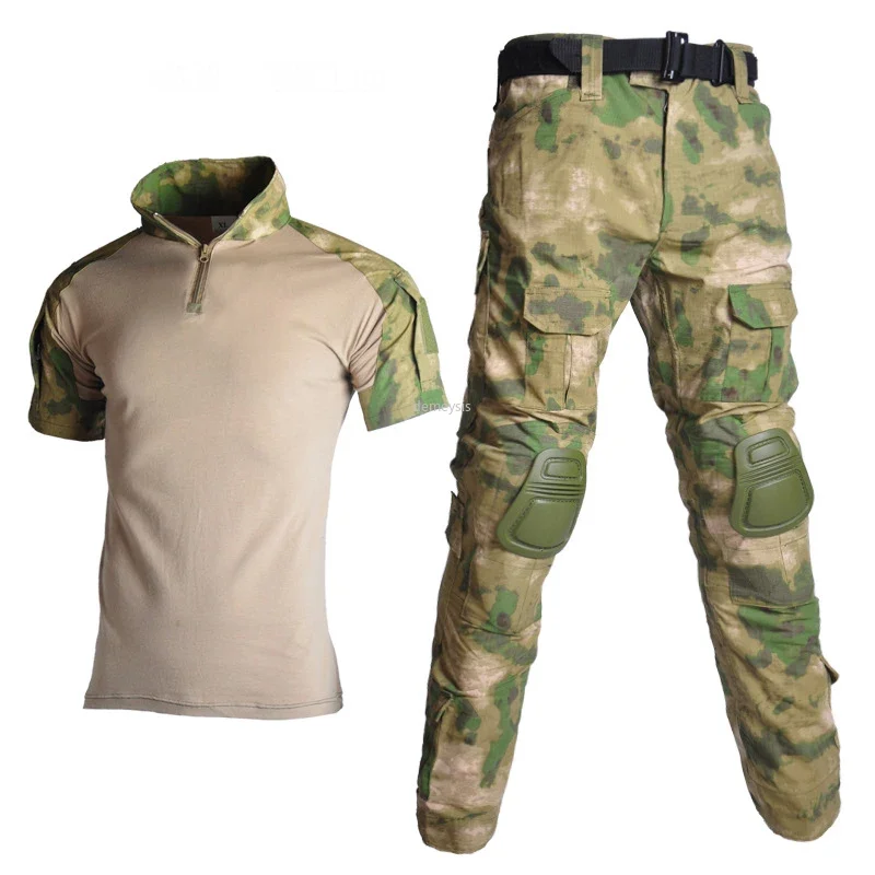 Uniforme de camuflaje Camisa táctica de verano Pantalones Rana Combate Ghillie Trajes Caza Camisa corta Pantalones Rodilleras Conjuntos