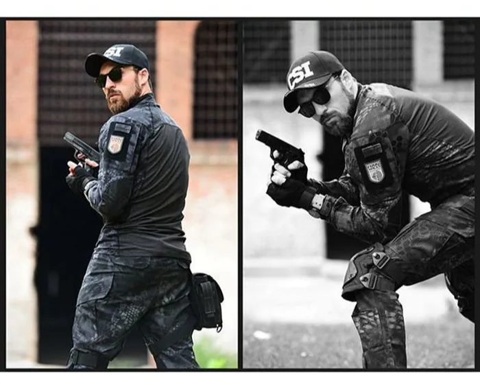 Nombre del producto: traje táctico de rana FG Color: negro, piel de pitón negro, Camuflaje negro, tamaño CP: S / M / L / XL / XXL característica: diseño novedoso, secado rápido, resistencia a arañazos apto para: deporte al aire libre, escalada, caza, tiro, juego de guerra. ... Paquete: 1 ropa + 1 pantalón