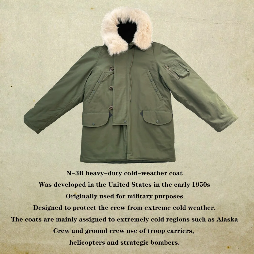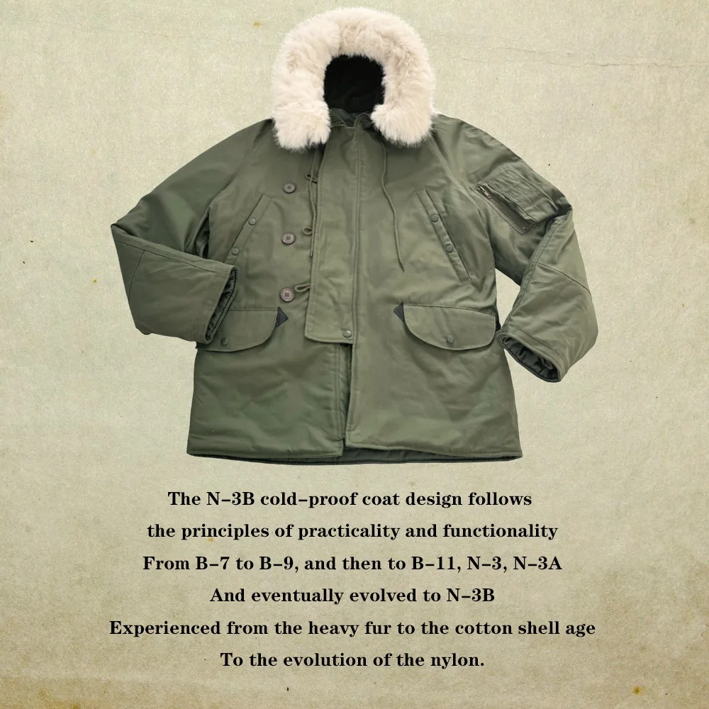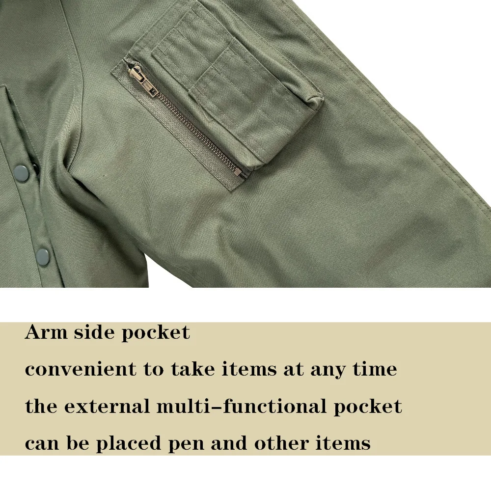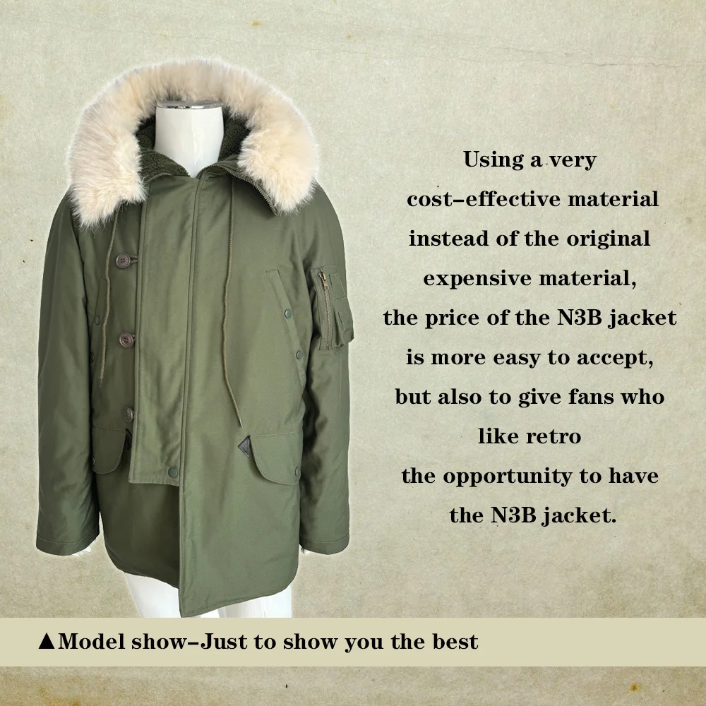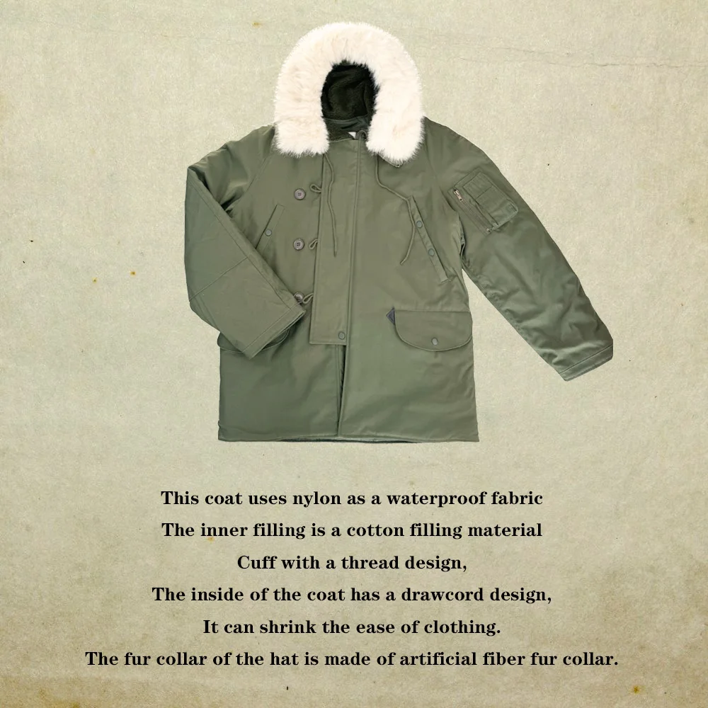 This jacket is a World War II American soldier jacket, the N3B company jacket. This jacket is made of cotton cloth and canvas. There are no pockets on the inside, but four pockets on the outside. The jacket has a drawstring at the waist and adjusts the easing of the jacket to make it better for your body. The jacket version is looser and more suitable for people who need casual training. The jacket is a World War II look with some later optimization to is more suitable for people today.