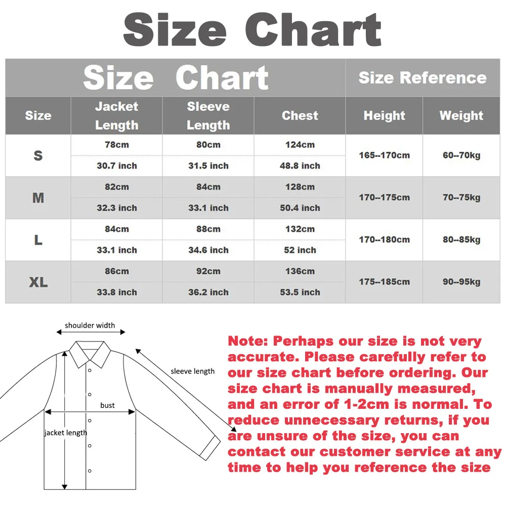 The dimensional data of the jacket were measured using manual methods. Due to different measurement methods, there may be different measurement data, but the error range is between 1 and 3 cm.
