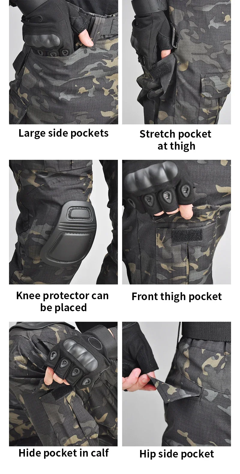 4.Cierres ajustables de gancho y bucle en la parte inferior y rodillas de los pantalones.