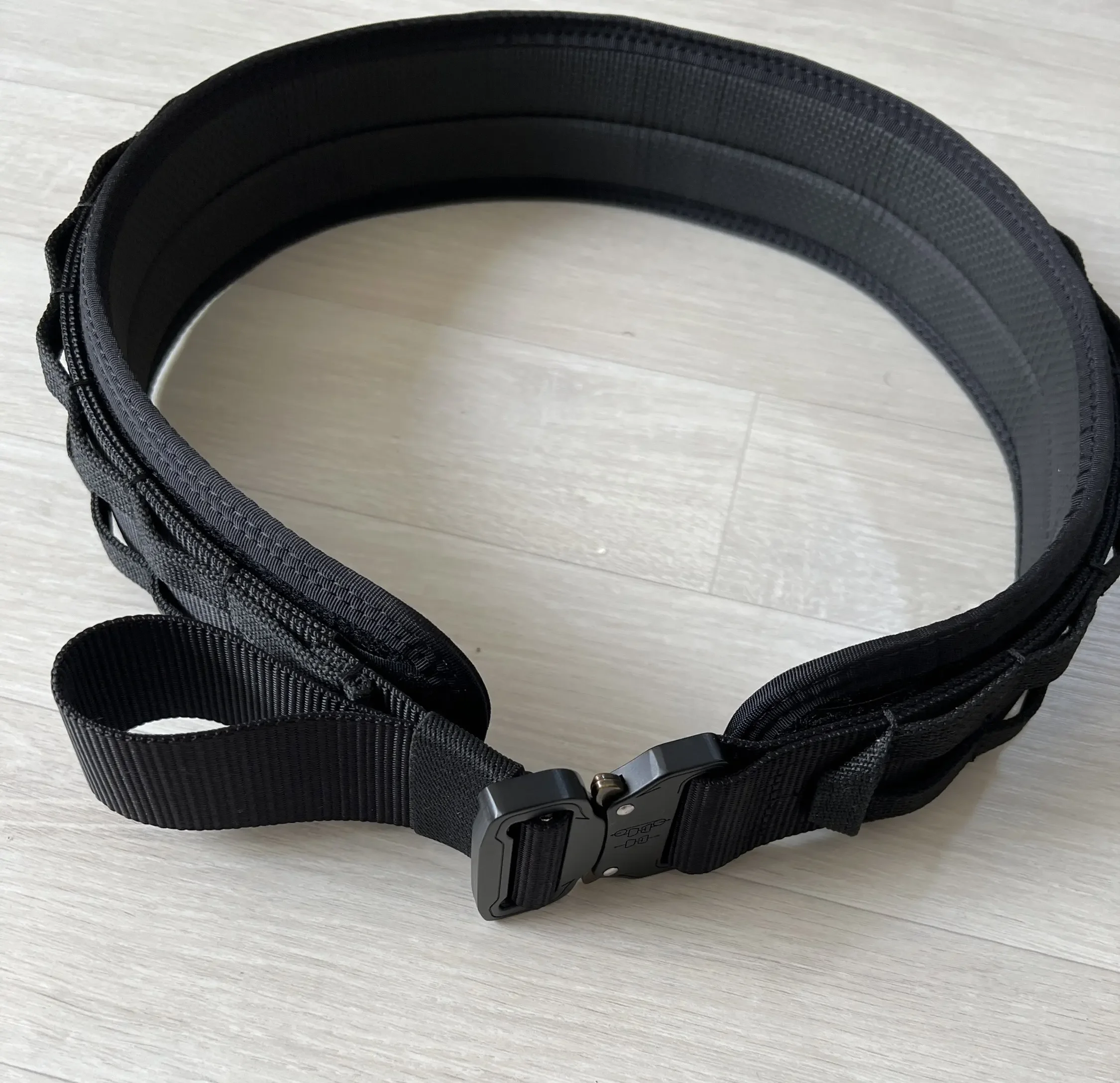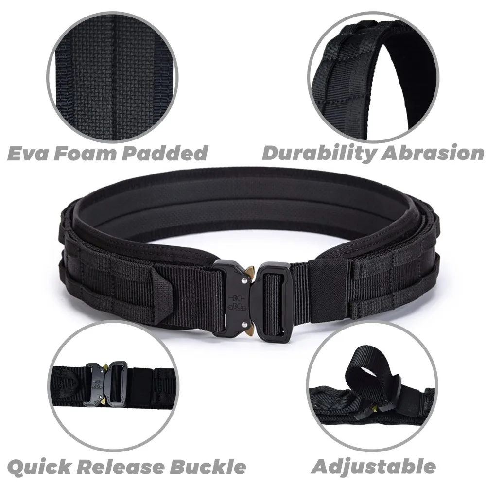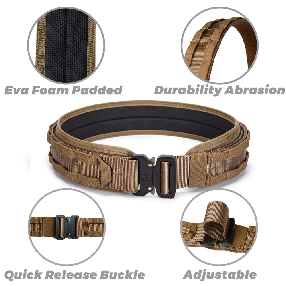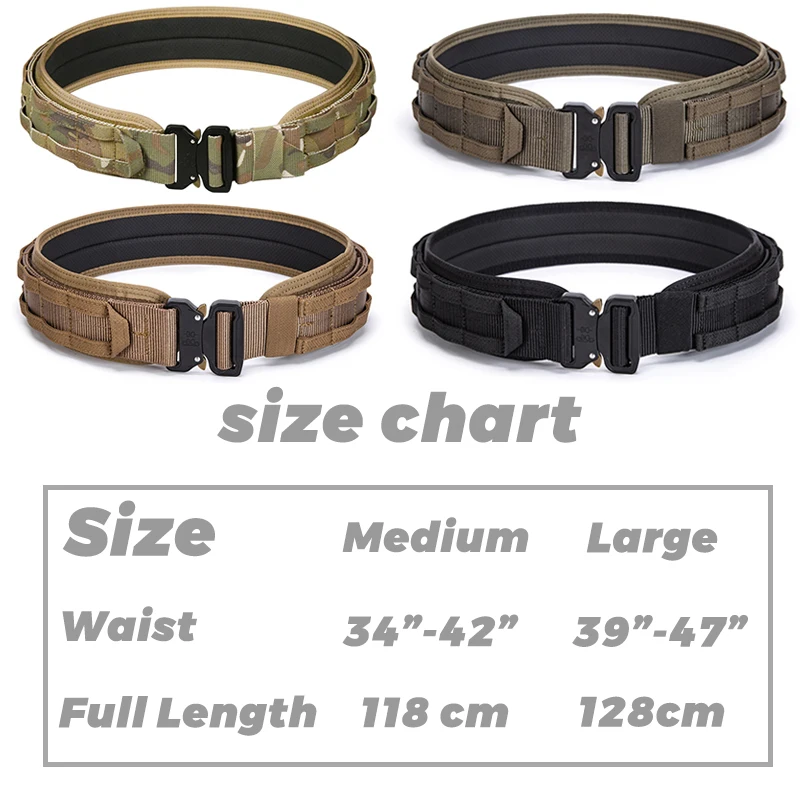Especificación: Tamaños disponibles:Medio (34"-42"), Grande (39"-47").El peso es de aproximadamente 1,1 libras.Colores disponibles: Negro, Marrón Coyote, Verde Ranger y CP.El paquete contiene un cinturón exterior de 1,75 pulgadas, un cinturón interior de 1,5 pulgadas y un cinturón interior acolchado.