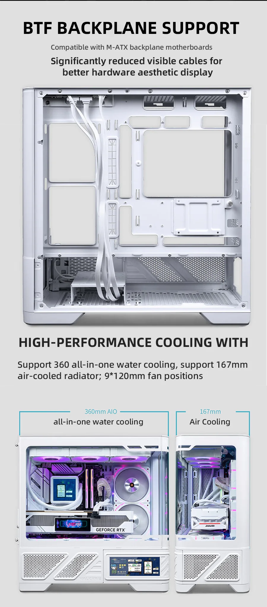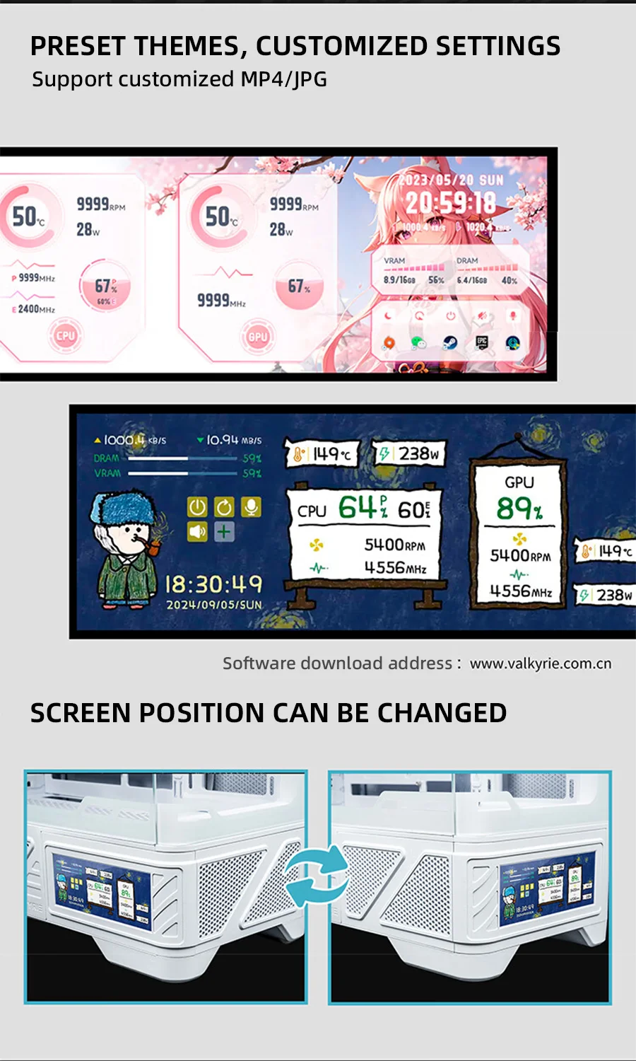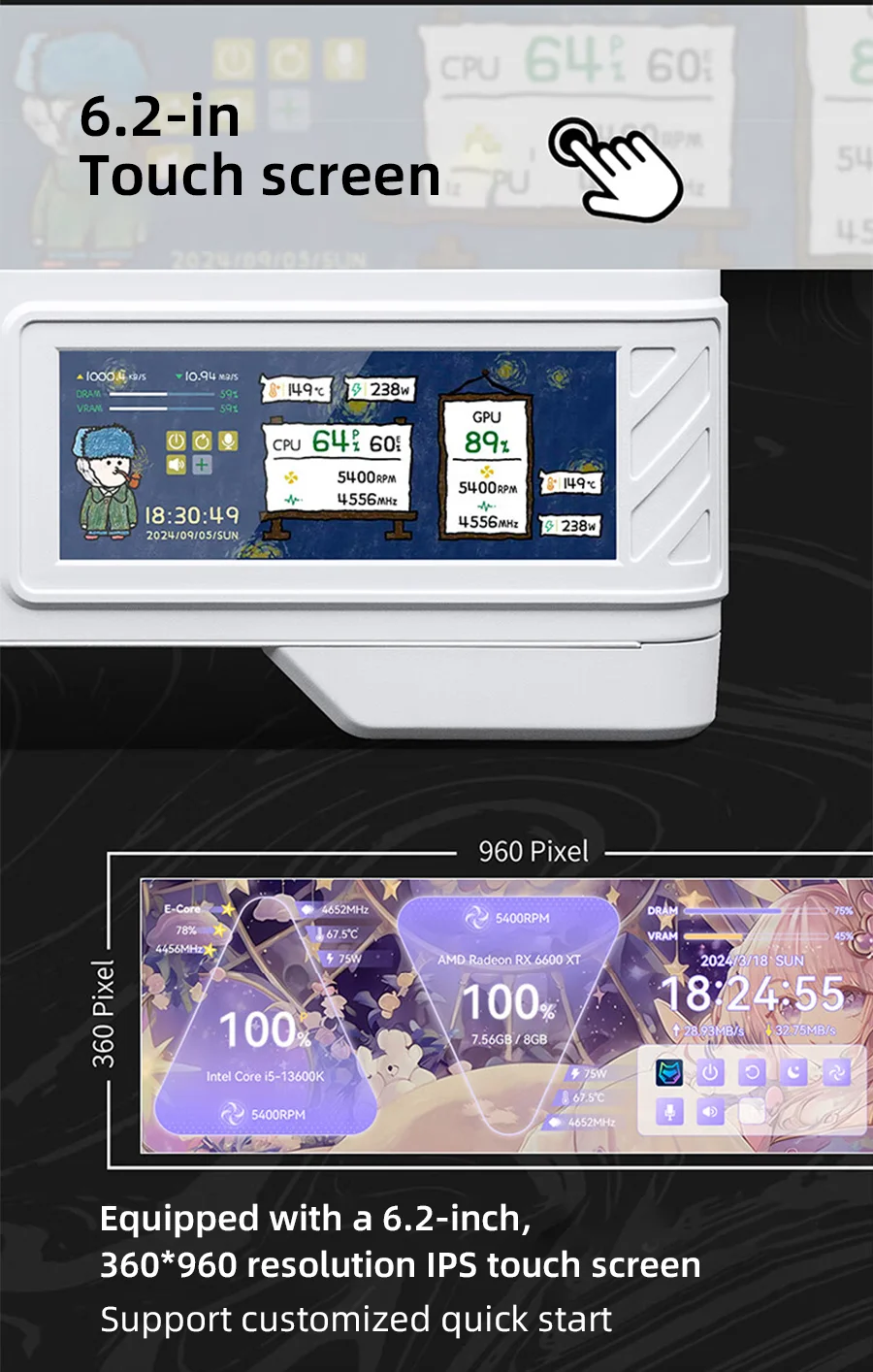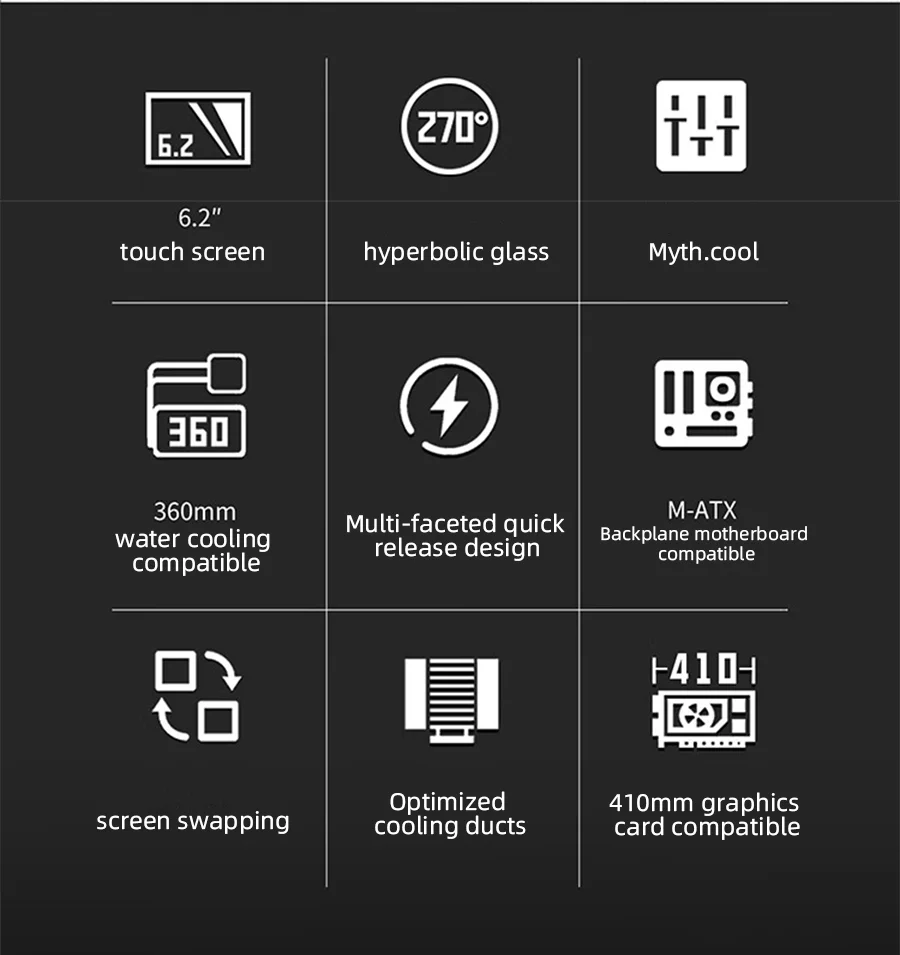VALKYRIE VK03-M LCD M-ATX Gaming PC Funda de escritorio compatible con refrigeración por agua 360 Pantalla táctil de 6,2 pulgadas Vidrio curvo 270 ° Sala de vista al mar