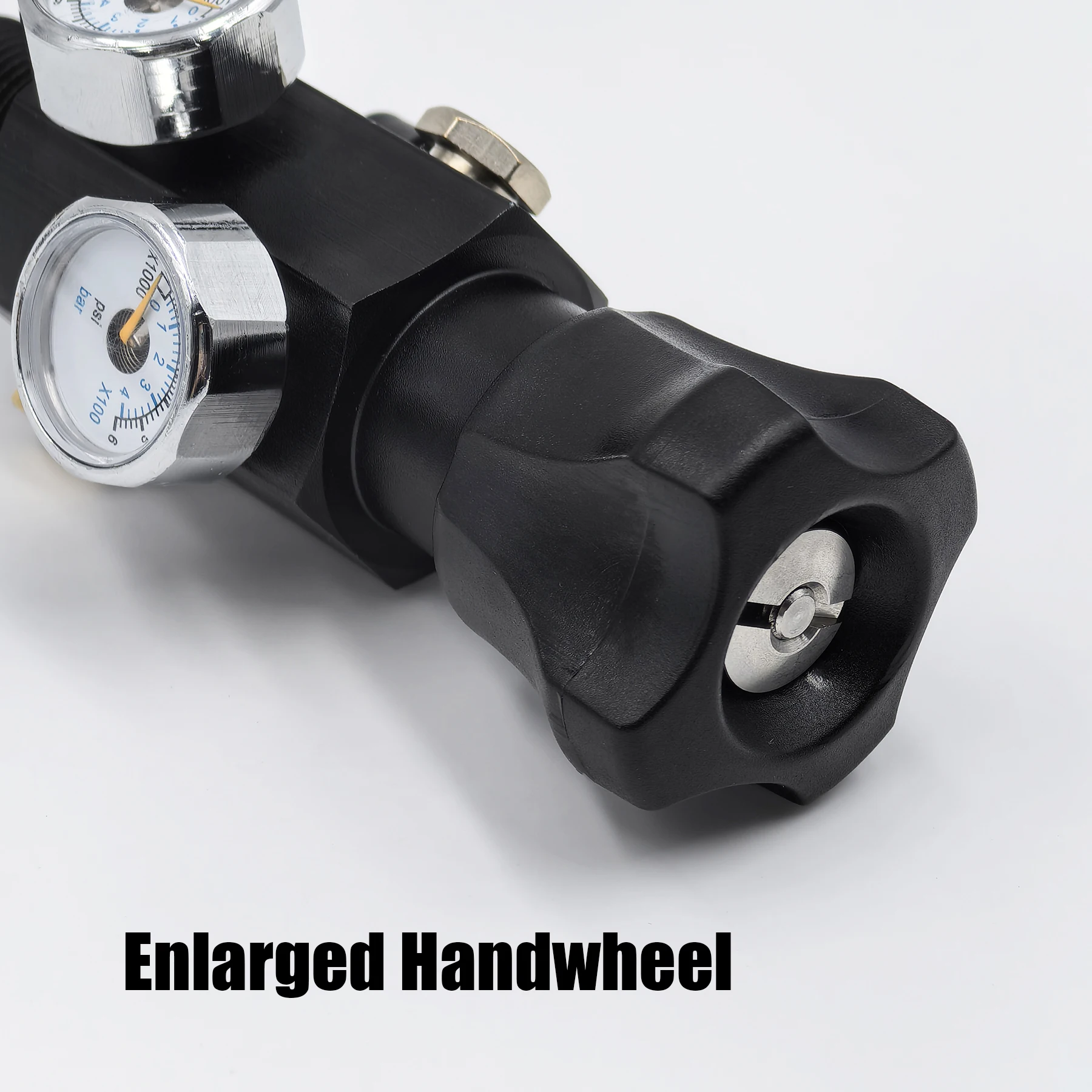 Diseño de dos manómetros, un manómetro muestra la presión dentro del cilindro y un manómetro muestra la presión durante el inflado.
