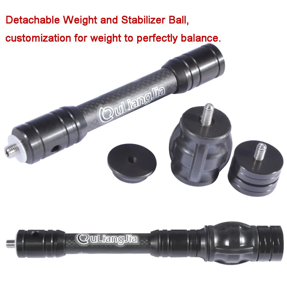 Características: 1. Hecho de fibra de carbono pura 3k, resistente y duradero. Fácil de instalar y desmontar, cómodo de usar. 2. Las radios están equipadas con amortiguadores y pesos desmontables para absorción de vibraciones y contraequilibrio.(Consejo: verifique cuidadosamente las imágenes del tamaño del producto, la longitud de la descripción del producto es la longitud de la varilla desnuda, además el contrapeso aumentará en 3 pulgadas en consecuencia). 3.Este estabilizador ralentiza el movimiento involuntario del arco.Aumente la precisión del disparo. 4. Es el accesorio más adecuado para la caza al aire libre, la práctica de caza, el tiro con arco, etc.