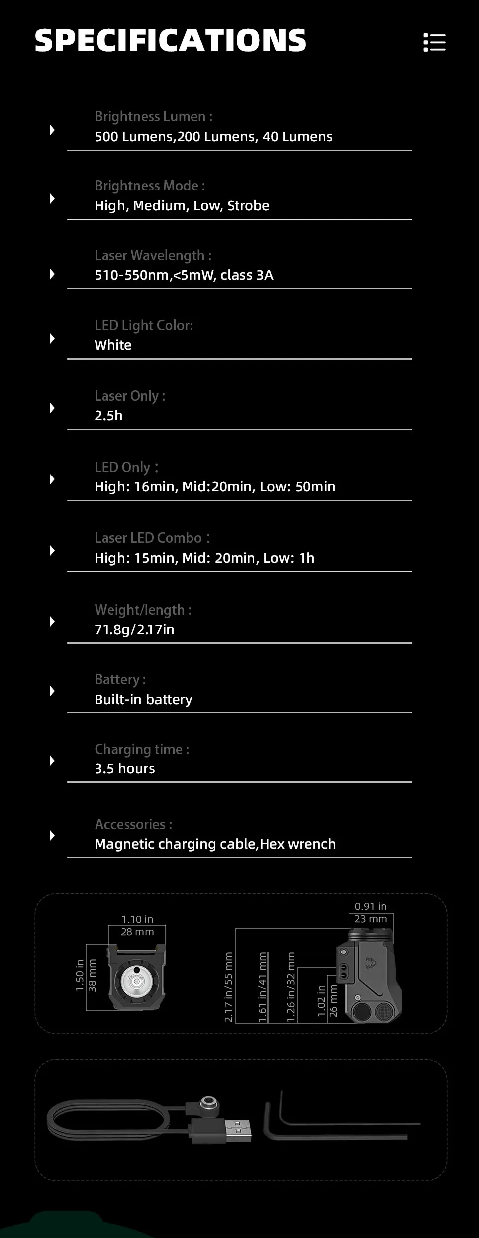 Linterna LED de 500 lúmenes, 630-660 nm, clase IIIa 5 mW láser rojo.