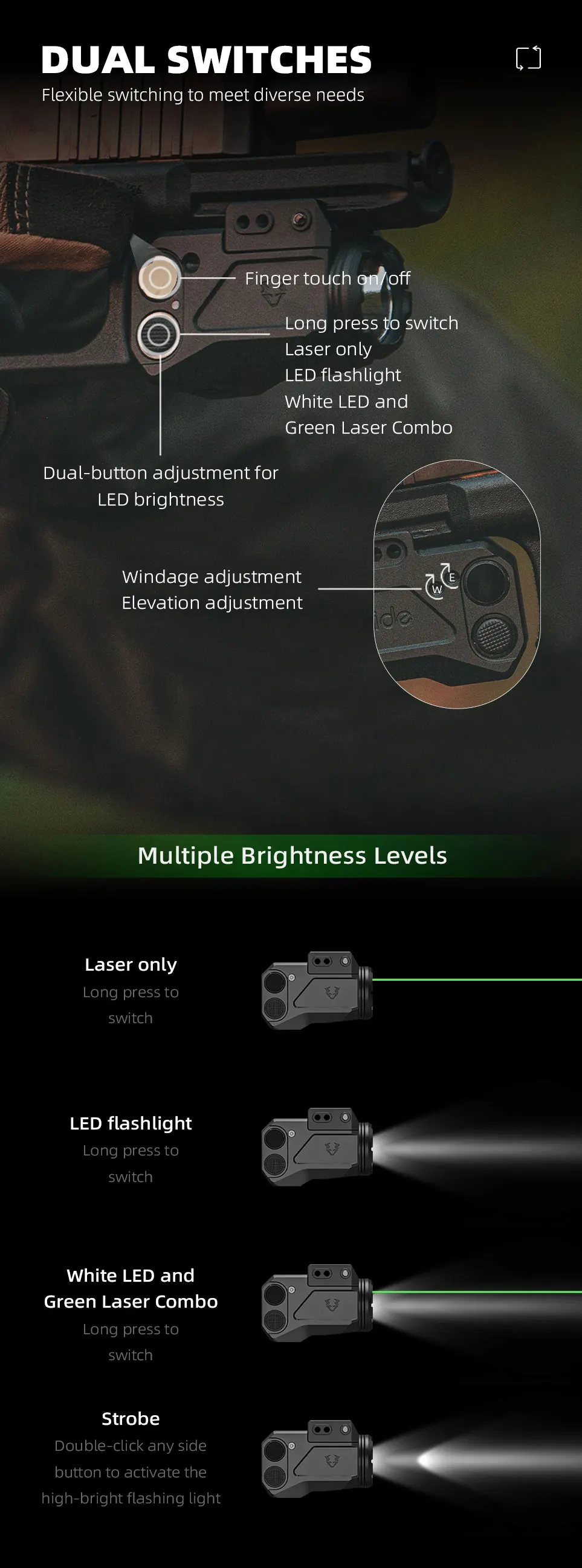Combinación de 3 niveles de brillo LED blanco, láser rojo, LED blanco y láser rojo, con función estroboscópica.