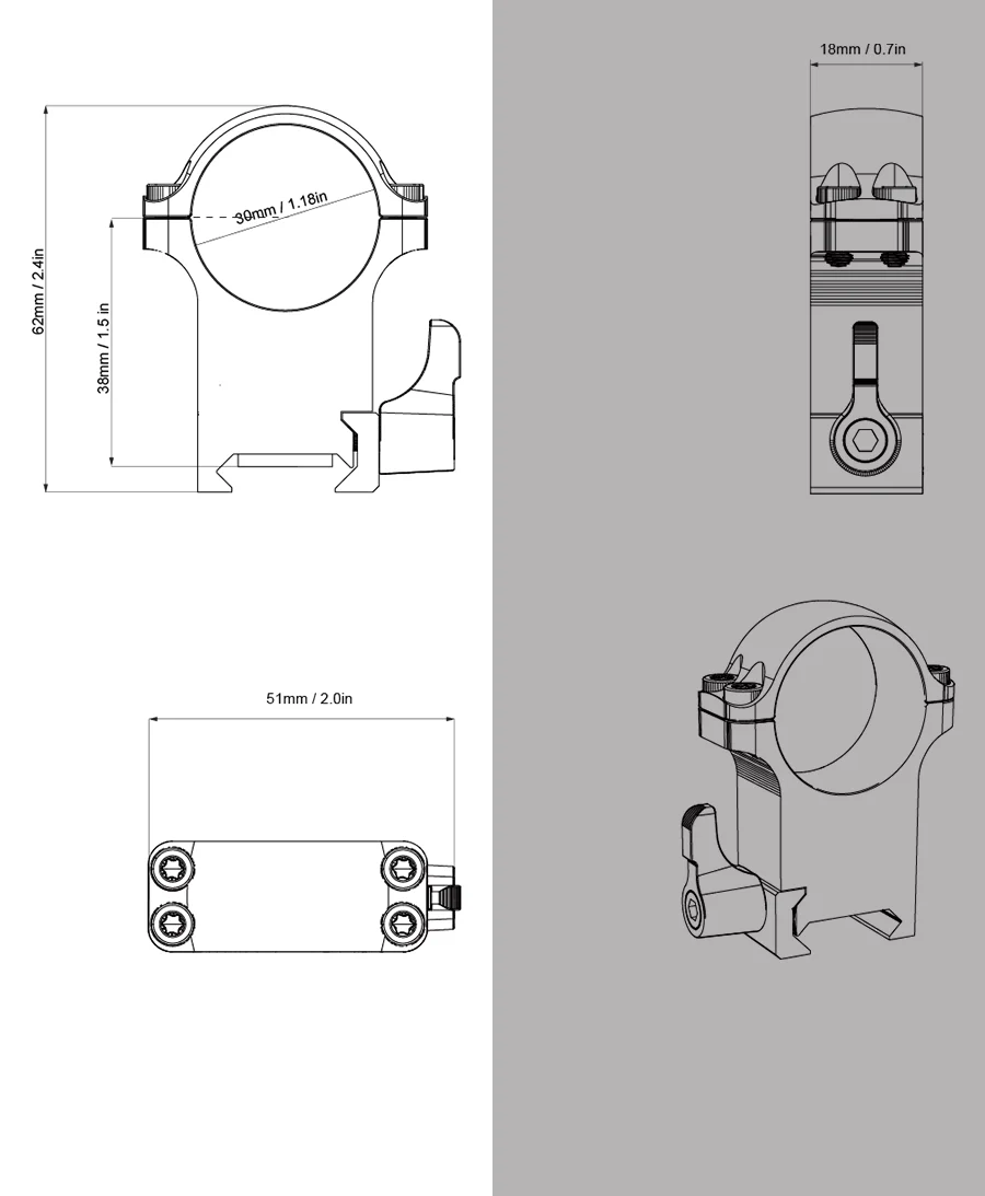 3. Ajuste en rieles Picatinny y Weaver de 21mm.