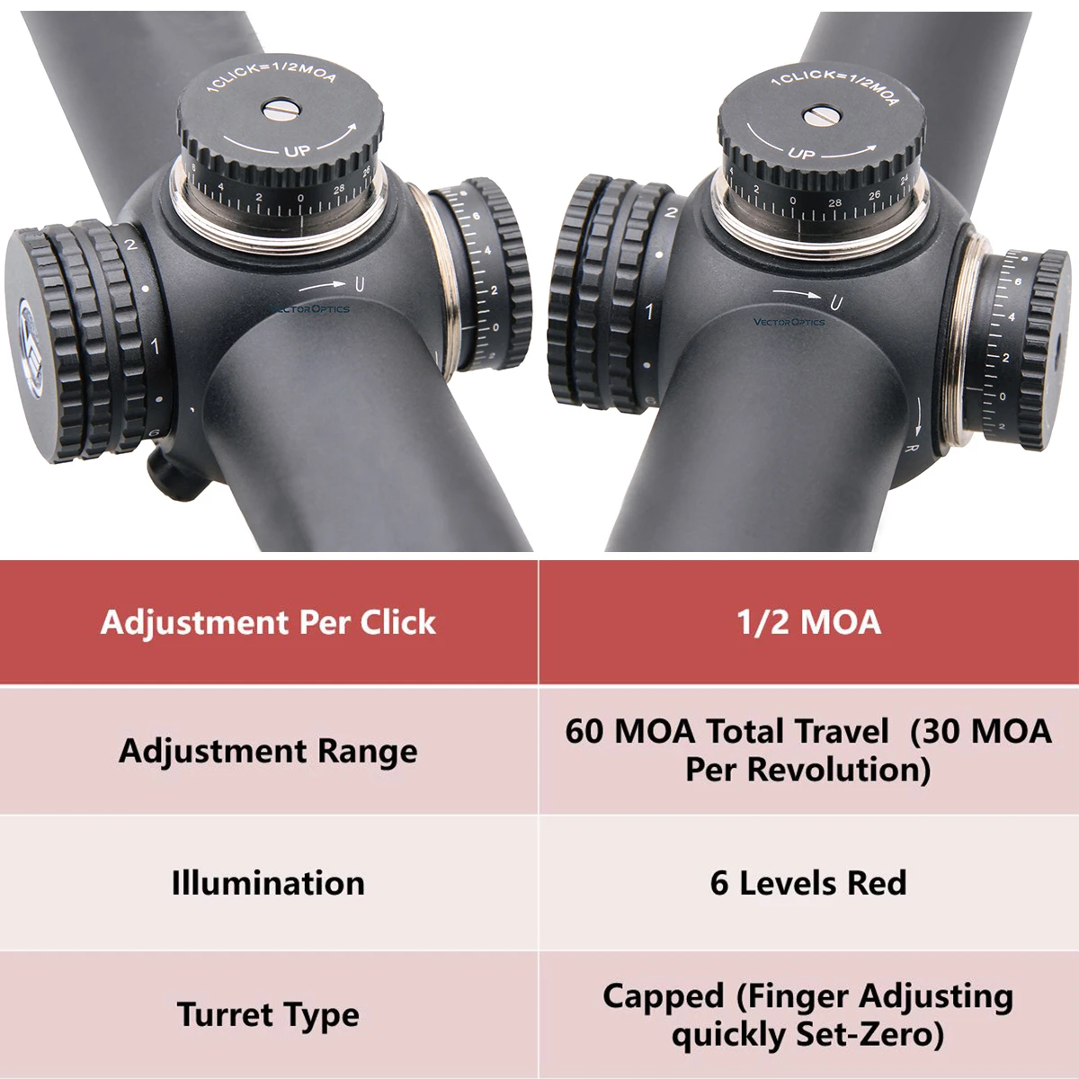 ·Monotubo de 30 mm, totalmente multicapa, ajuste de 1/2 MOA tapado, ajuste cero