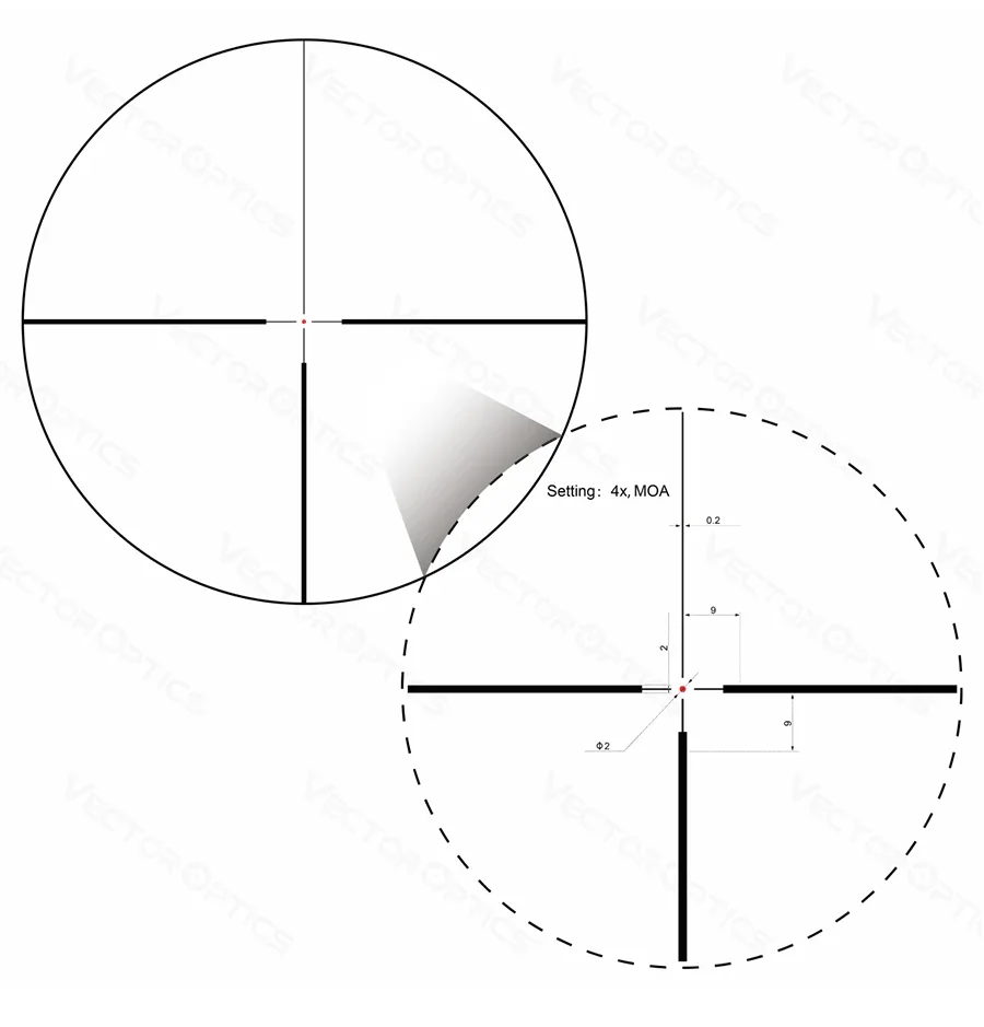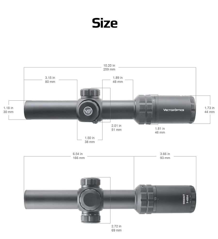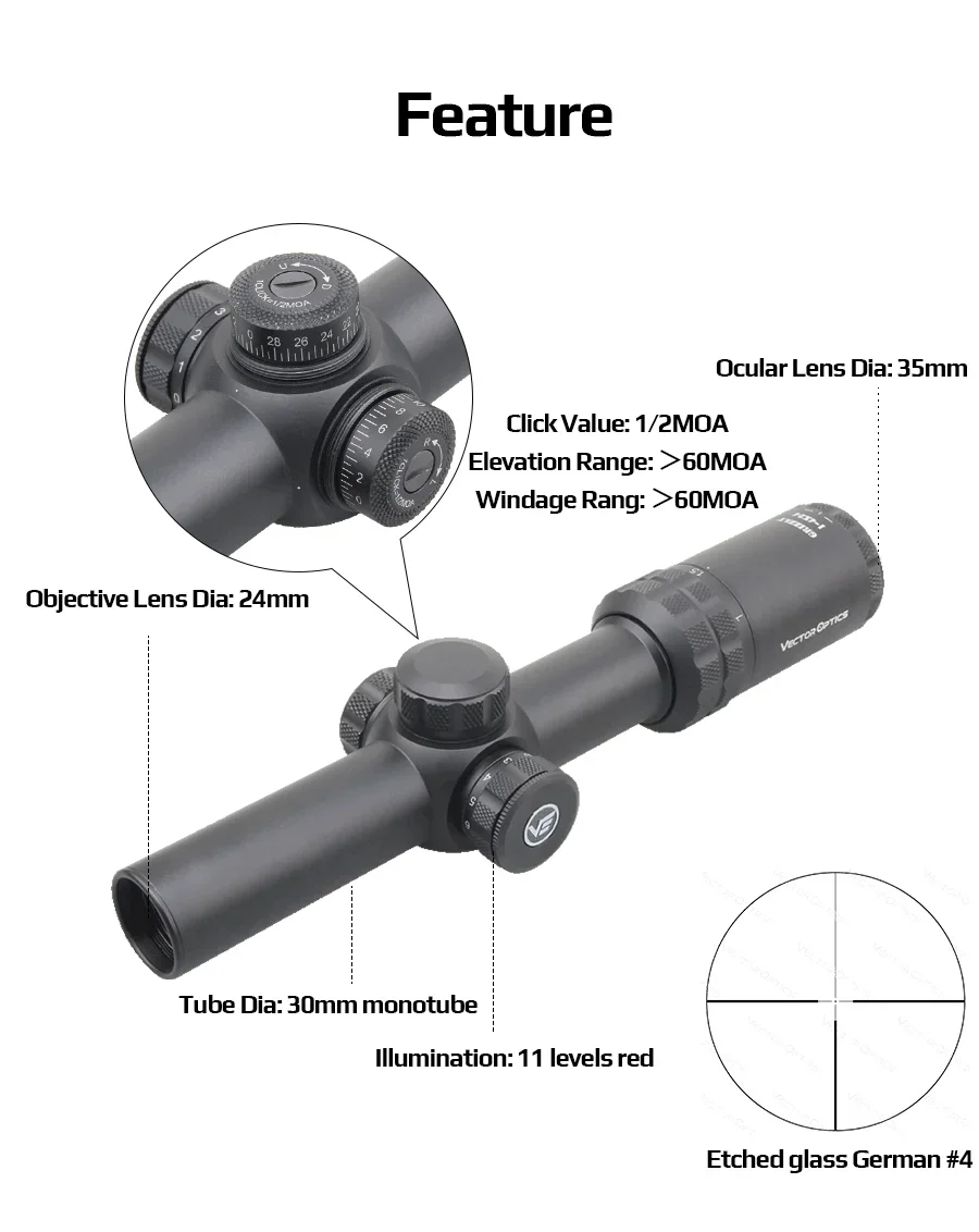 • Retícula iluminada en vidrio grabado alemán#4, amplio campo de visión, alivio ocular de 4 pulgadas de largo