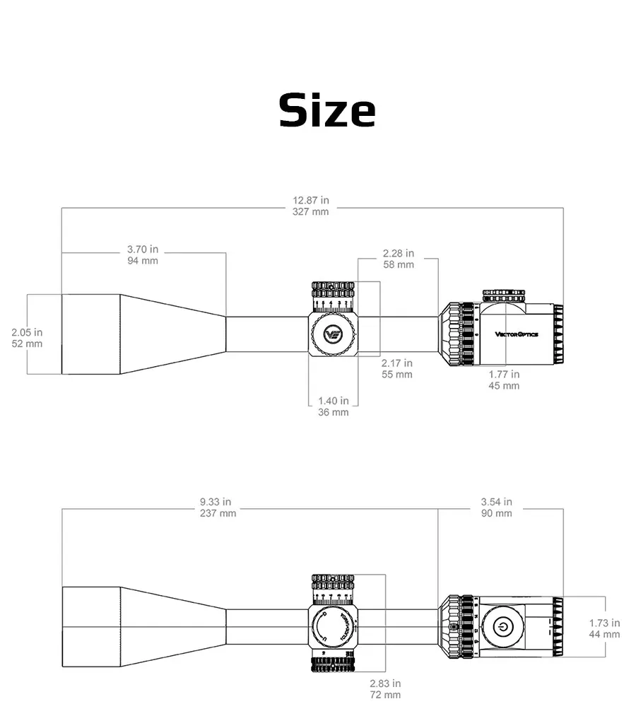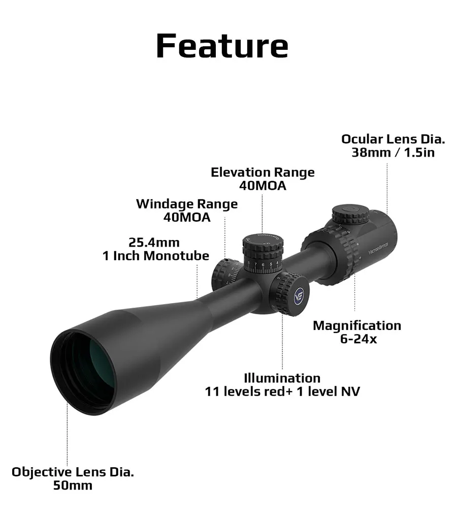 Marcas de enfoque lateral: 10, 15, 20, 50, 100, 200, 500 y yardas infinitas