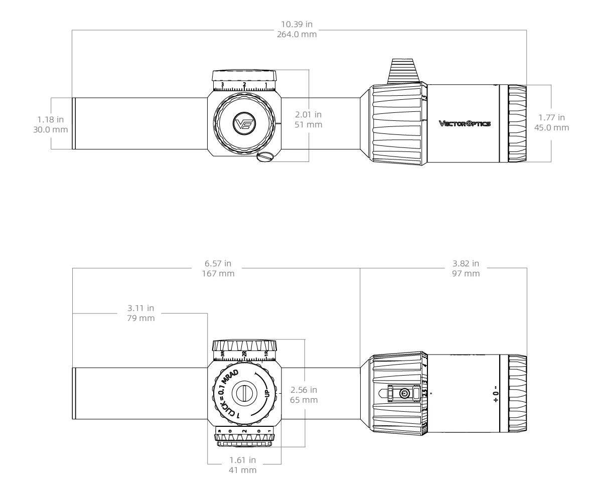 · El diámetro del tubo de 30 mm amplía el rango de elevación y deriva a 60 MIL con valor de clic de 0,1 MRAD