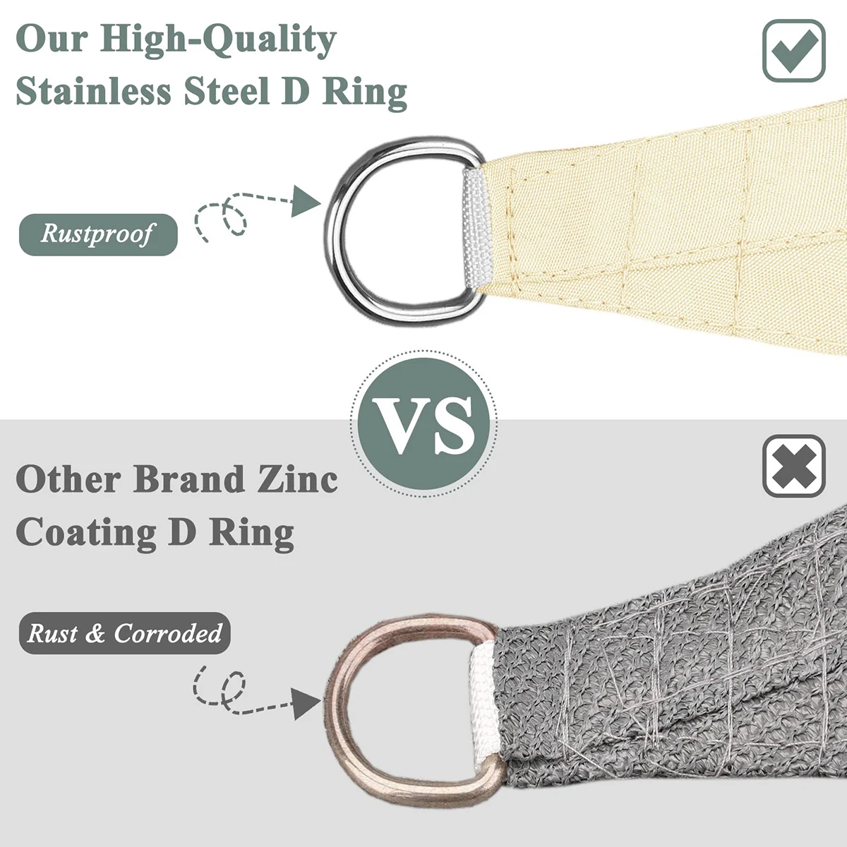 9. Anillo D: el anillo D de acero inoxidable es el componente básico de la vela parasol. Es duradero y puede prolongar la vida útil de la vela parasol.