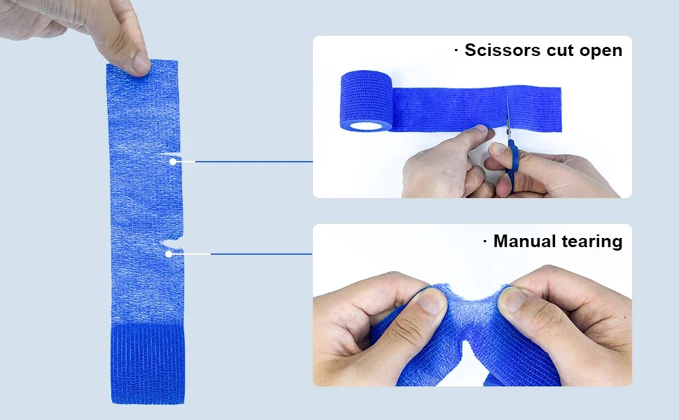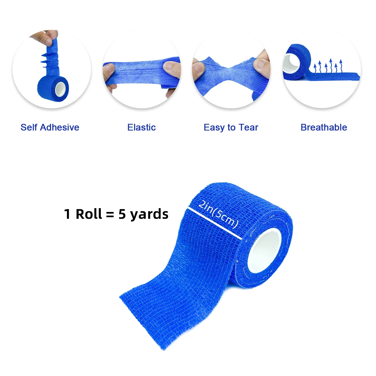 -Envoltura de vendaje autoadherente: la envoltura de vendaje es una cinta fuerte autoadherente que ofrece un excelente soporte, a diferencia de los vendajes no adhesivos, la envoltura de vendaje autoadhesiva no requiere clips ni alfileres.