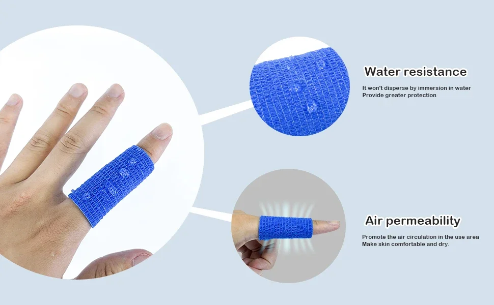 -Envoltura de vendaje autoadherente: la envoltura de vendaje es una cinta fuerte autoadherente que ofrece un excelente soporte, a diferencia de los vendajes no adhesivos, la envoltura de vendaje autoadhesiva no requiere clips ni alfileres.