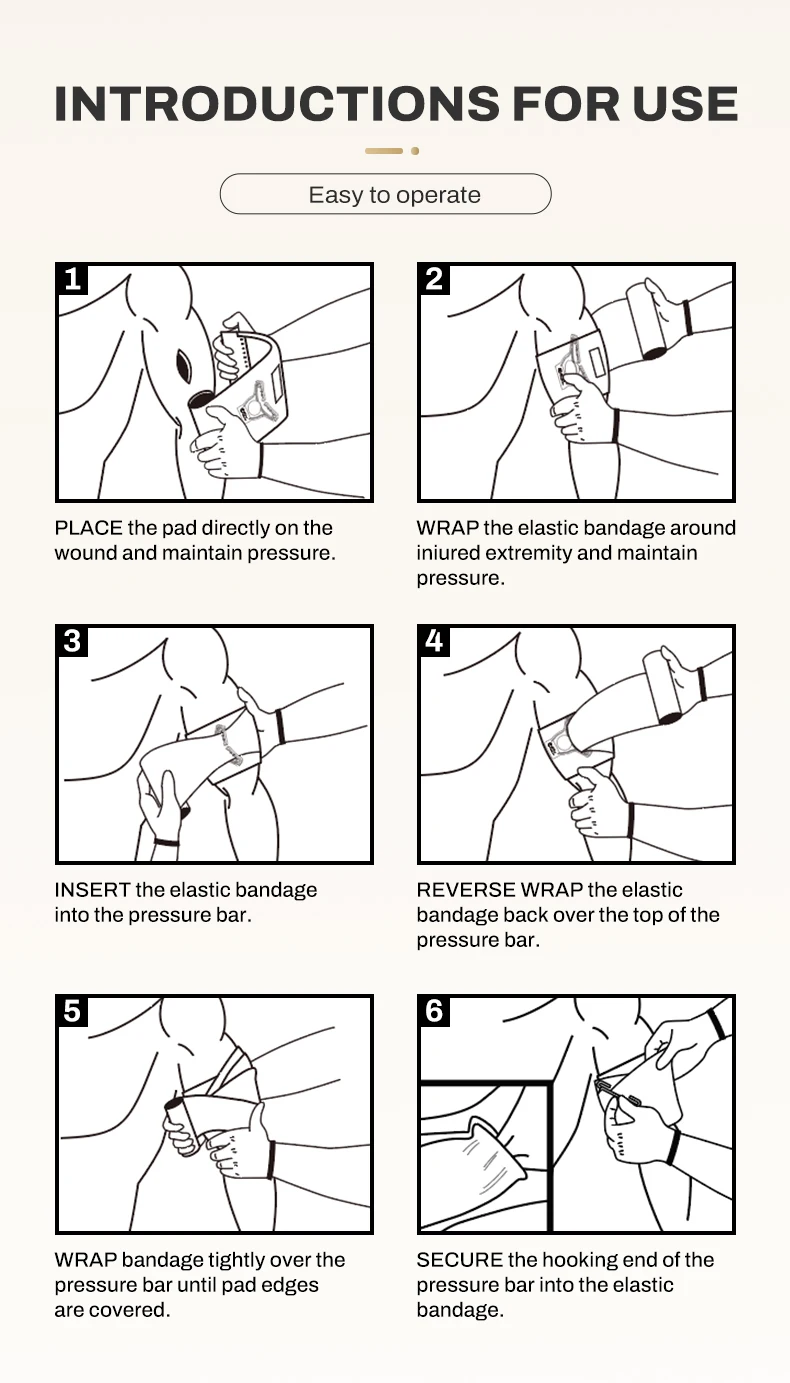The trauma bandage is designed for quick and easy application by professional and non-professional caregivers to provide effective, multi-functional treatment. The product is so easy to use that even an injured person can self-apply the bandage with one hand.