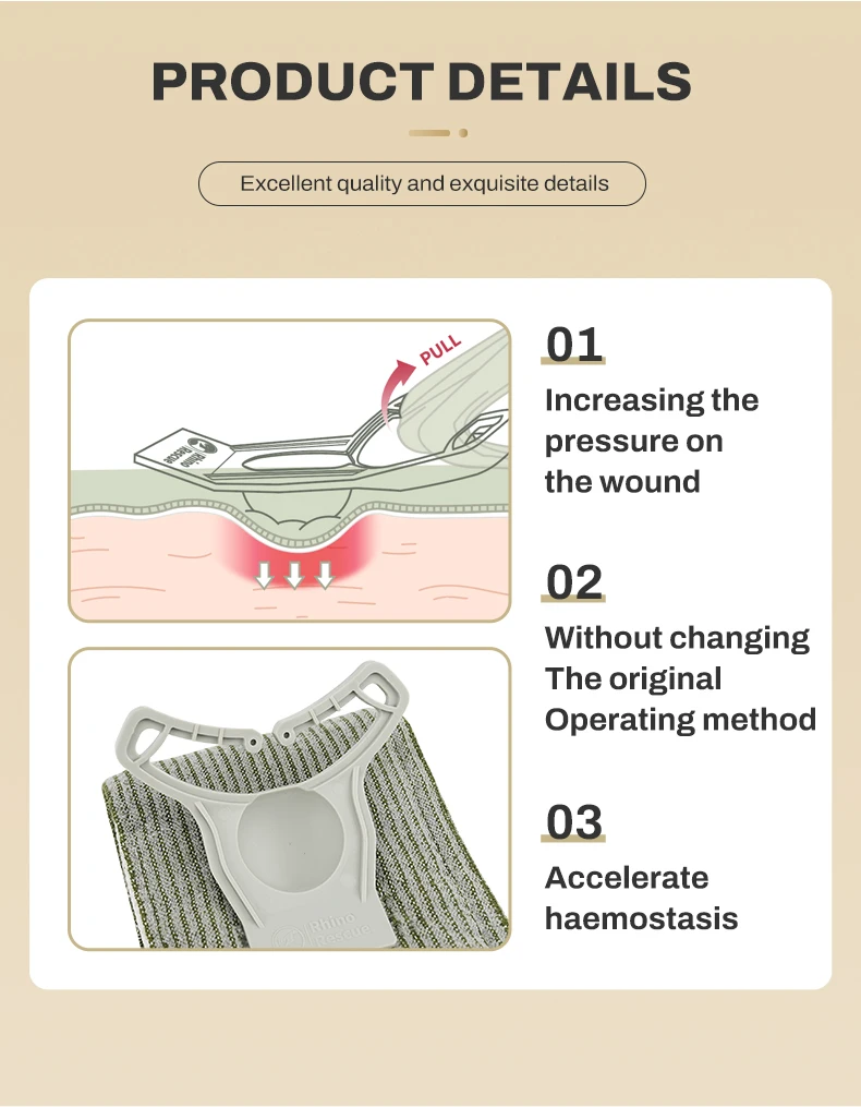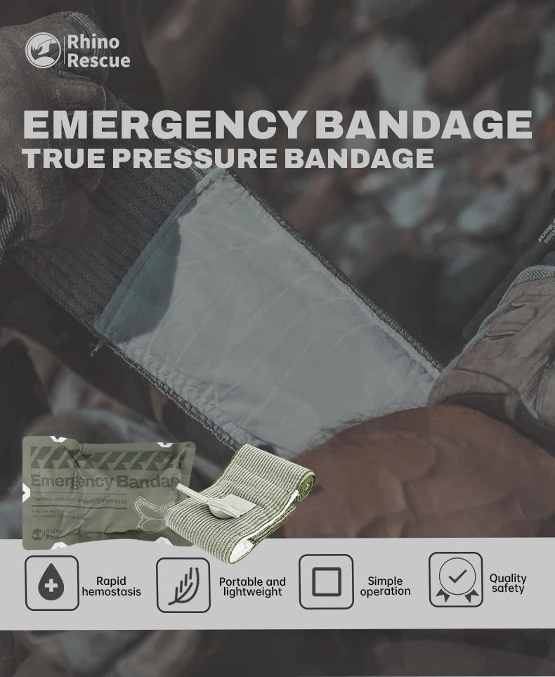 The RHINO RESCUE compression bandage is a tactical first-aid device for the staunching of blood flow from traumatic hemorrhage wounds in pre-hospital emergency situations.
