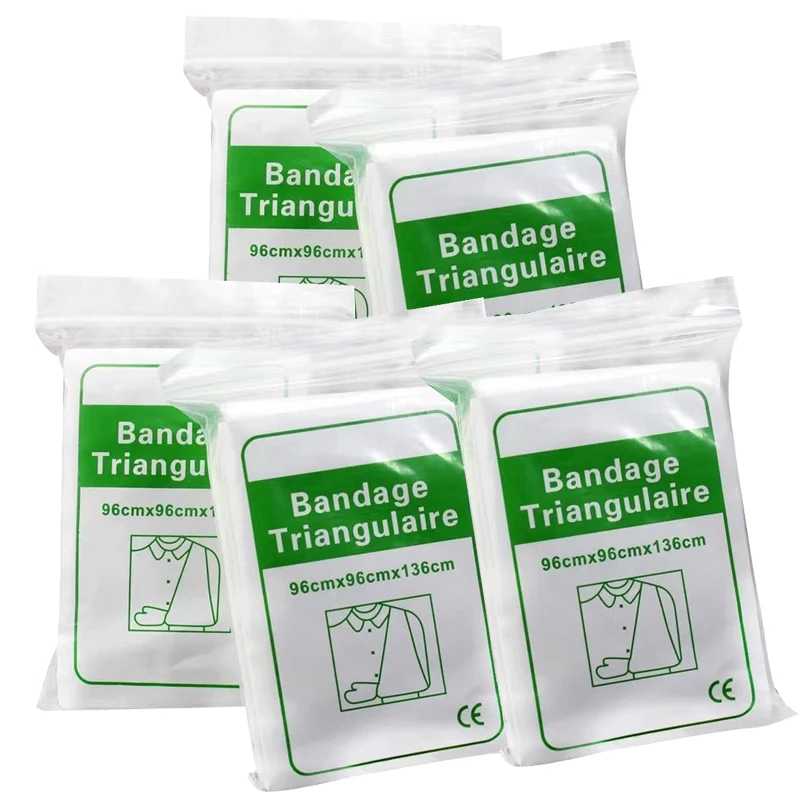 Características: Alta calidad Vendaje médico vendaje Triangular Primeros Auxilios fractura fijación emergencia Color: blanco Tipo de suministros de primeros auxilios: vendaje Triangular Tamaño: 96*96*136 CM Paquete: 2/5/10 piezas (opcional)