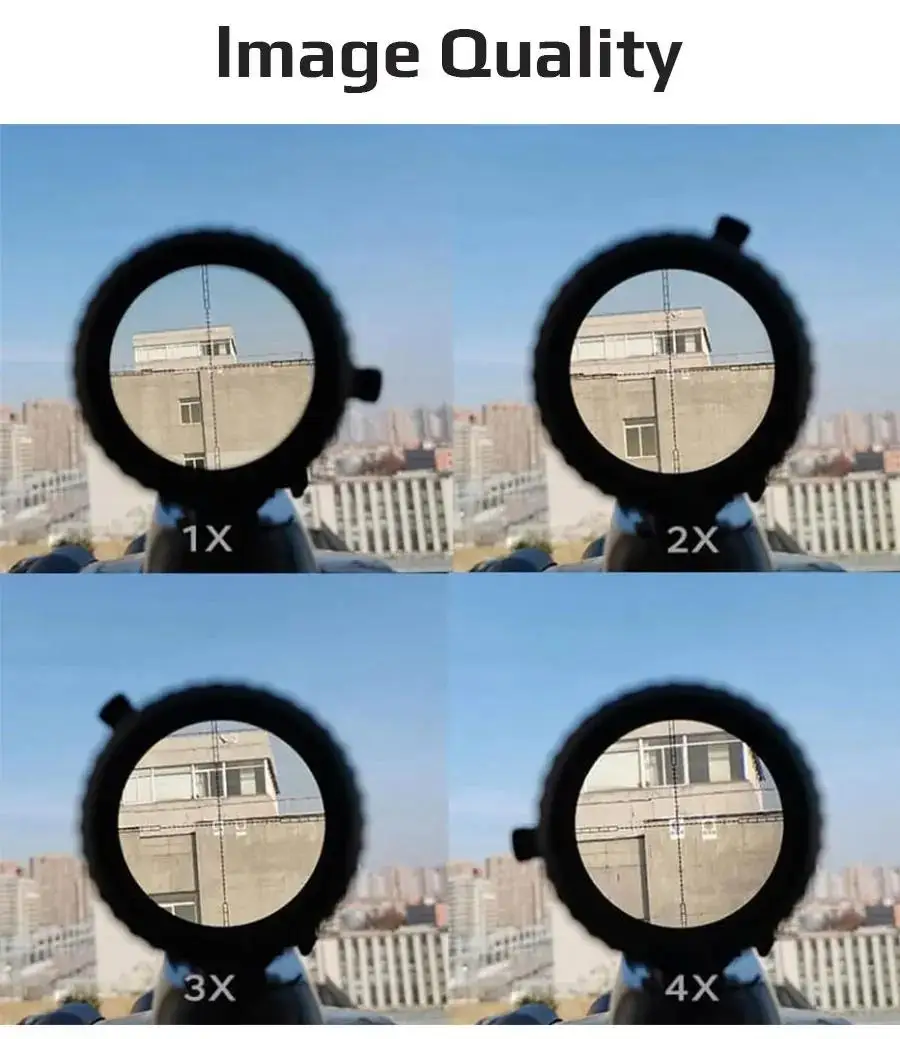 El alcance variable de 1 a 4x proporciona una imagen muy nítida.Con un aumento de 1x, se puede utilizar en un CQB feroz para apuntar rápidamente, como un punto rojo.Mientras que está en 4x, es ideal para disparos de rango medio a más largo.