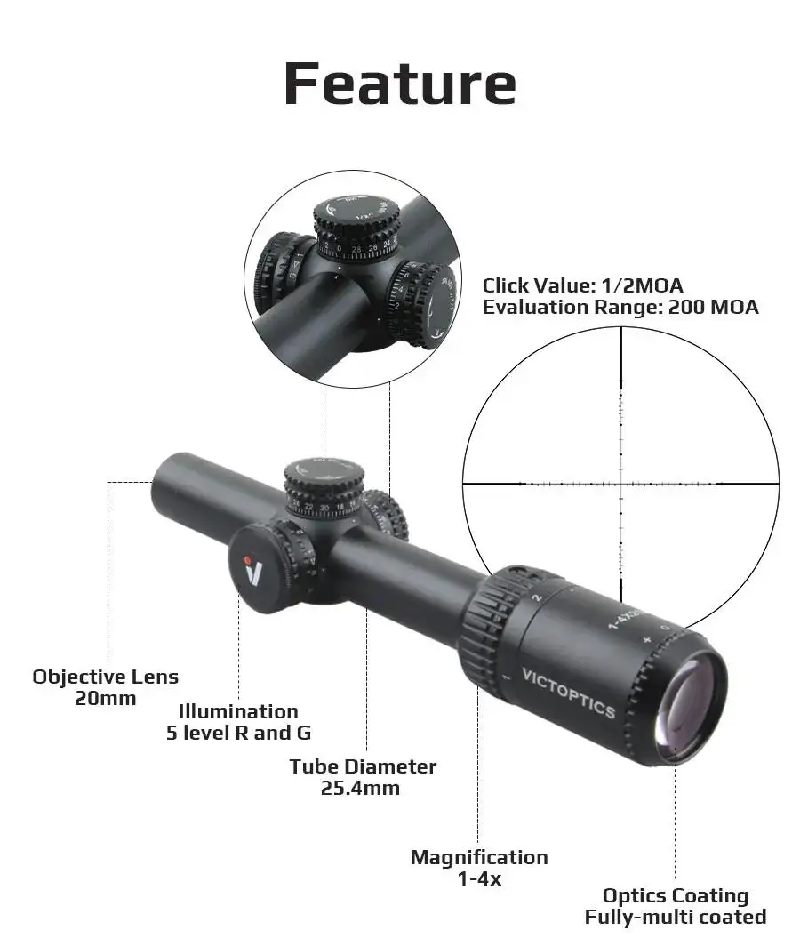 Peso ligero, sólo 320 g, puedes llevarlo a donde quieras sin esfuerzo.Monte este LPVO compacto de 1 a 4x en su rifle de aire, aún puede sostenerlos fácilmente con una sola mano.Como es súper compacto, ¡también puedes montar este visor de rifle en una pistola si lo deseas!