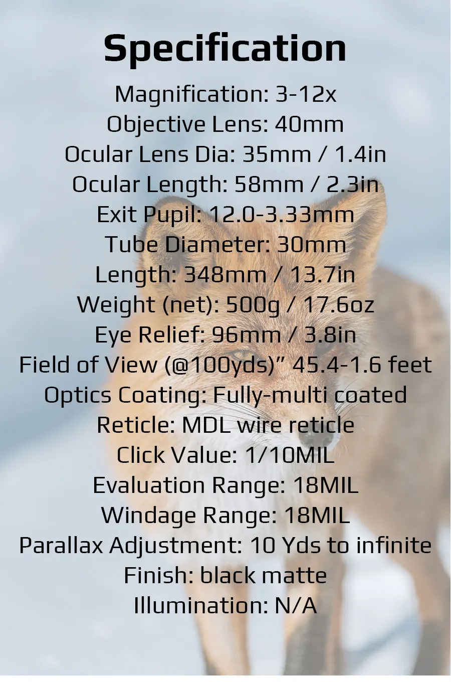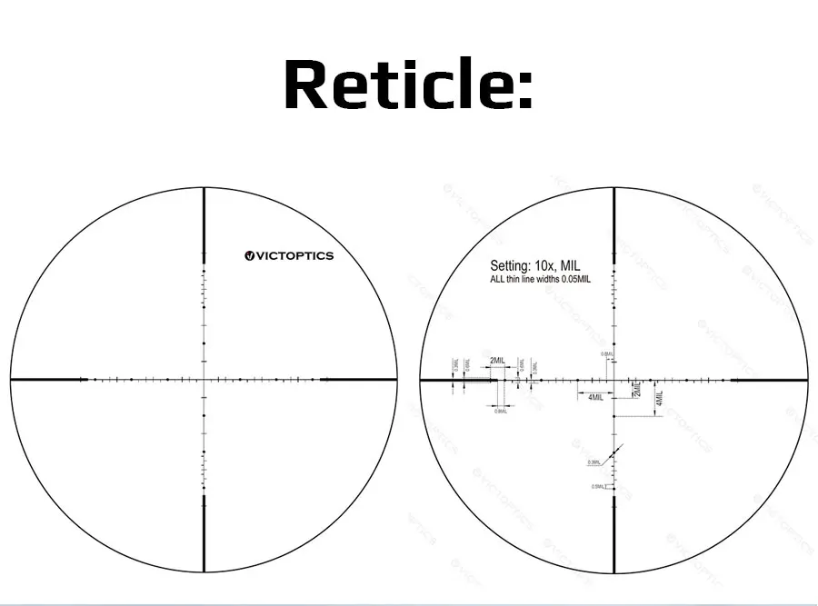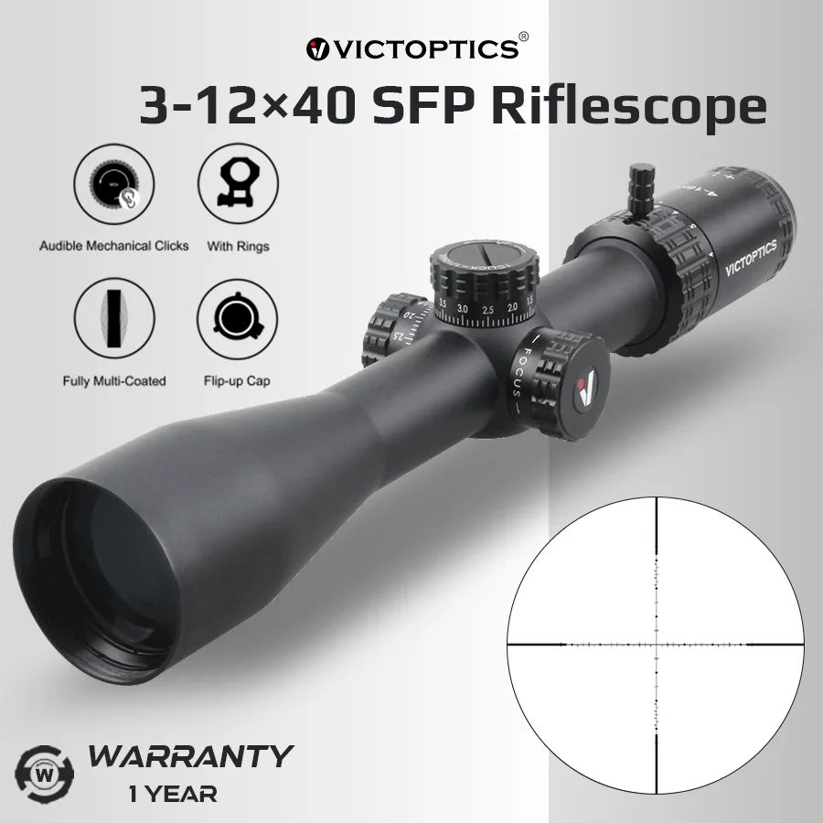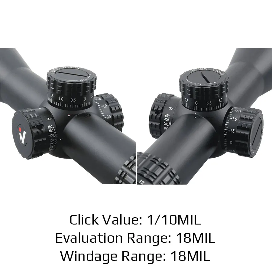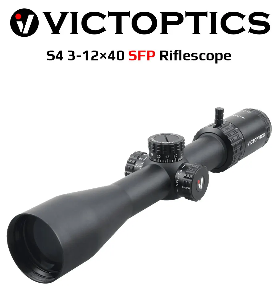 El visor VictOptics S4 3-12×40 SFP es un visor de torreta con bloqueo, que evita movimientos accidentales de las torretas, por lo tanto mejor para uso en exteriores.El valor del clic es 1/10MIL, con un rango de ajuste total de 18MIL.