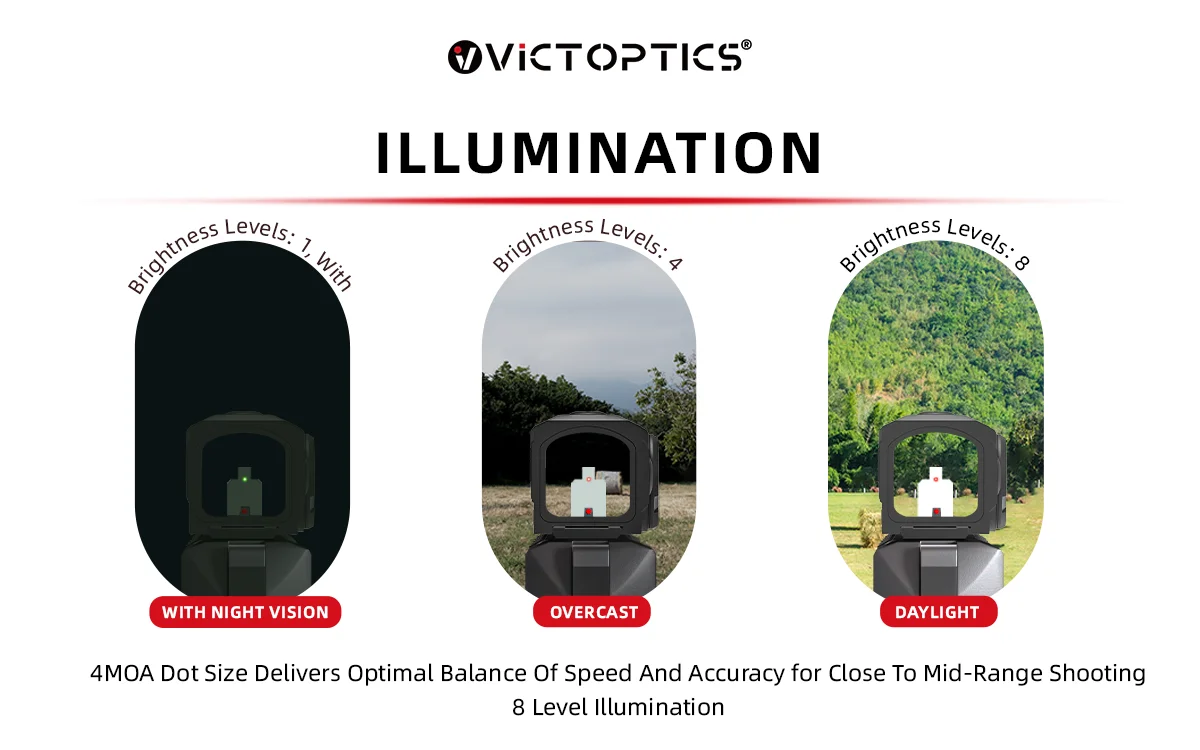 El tamaño de punto 4MOA ofrece un equilibrio óptimo entre velocidad y precisión para disparos cercanos a medio alcance
