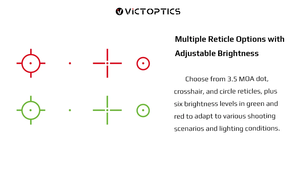 Cuatro opciones de retícula, incluidos punto, crosshair y círculo de 3,5 MOA para varios escenarios de disparo