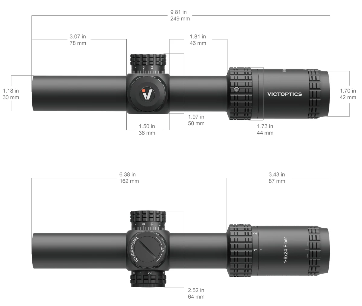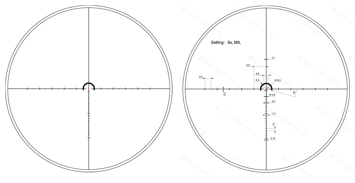 • Ajuste de 1/5 MIL con características de reinicio cero y bloqueo de torreta, acabado negro mate.