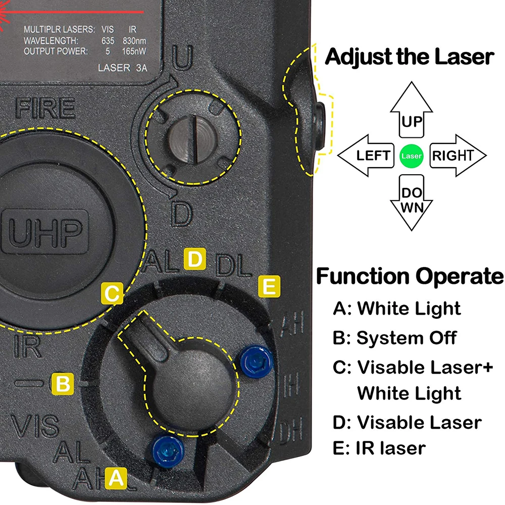 Tactical Switch – Easy to control. Button & Remote Control Switch works with the selector switch. Includes five types for choice: LED flashlight / IR Laser/ Green laser sight / LED Flashlight + IR Laser/ LED Flashlight + Green laser sight.