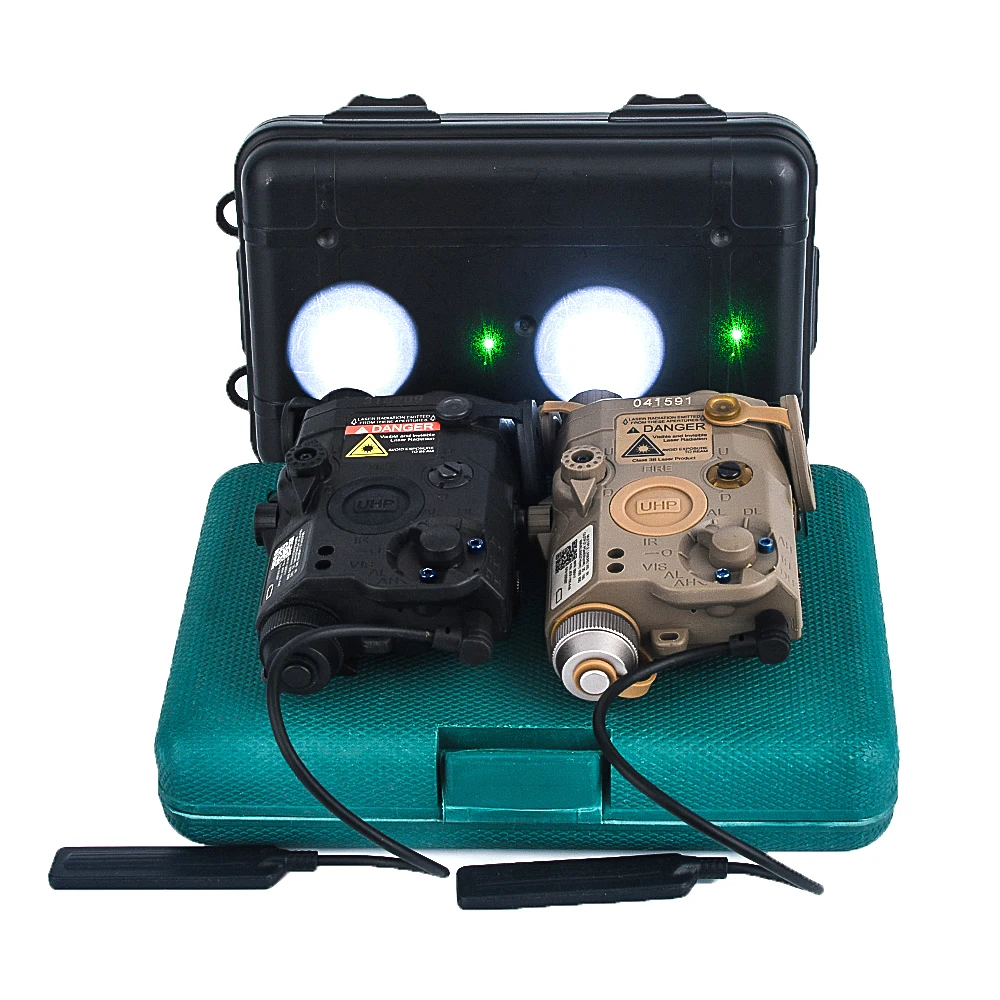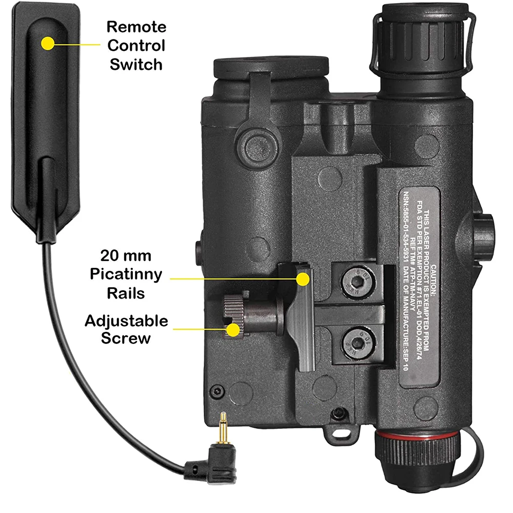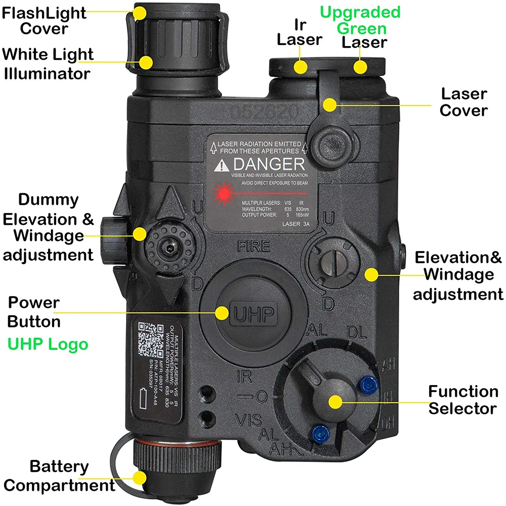 PEQ 15 Pro – UHP visible green laser and IR laser are adjusted easily and freely through the box body screw fixed. An upgraded version of the IR glass lenses. Upgraded electric box and CREE XML lamp bead high order 5V~7.6 constant make photometric stronger.
