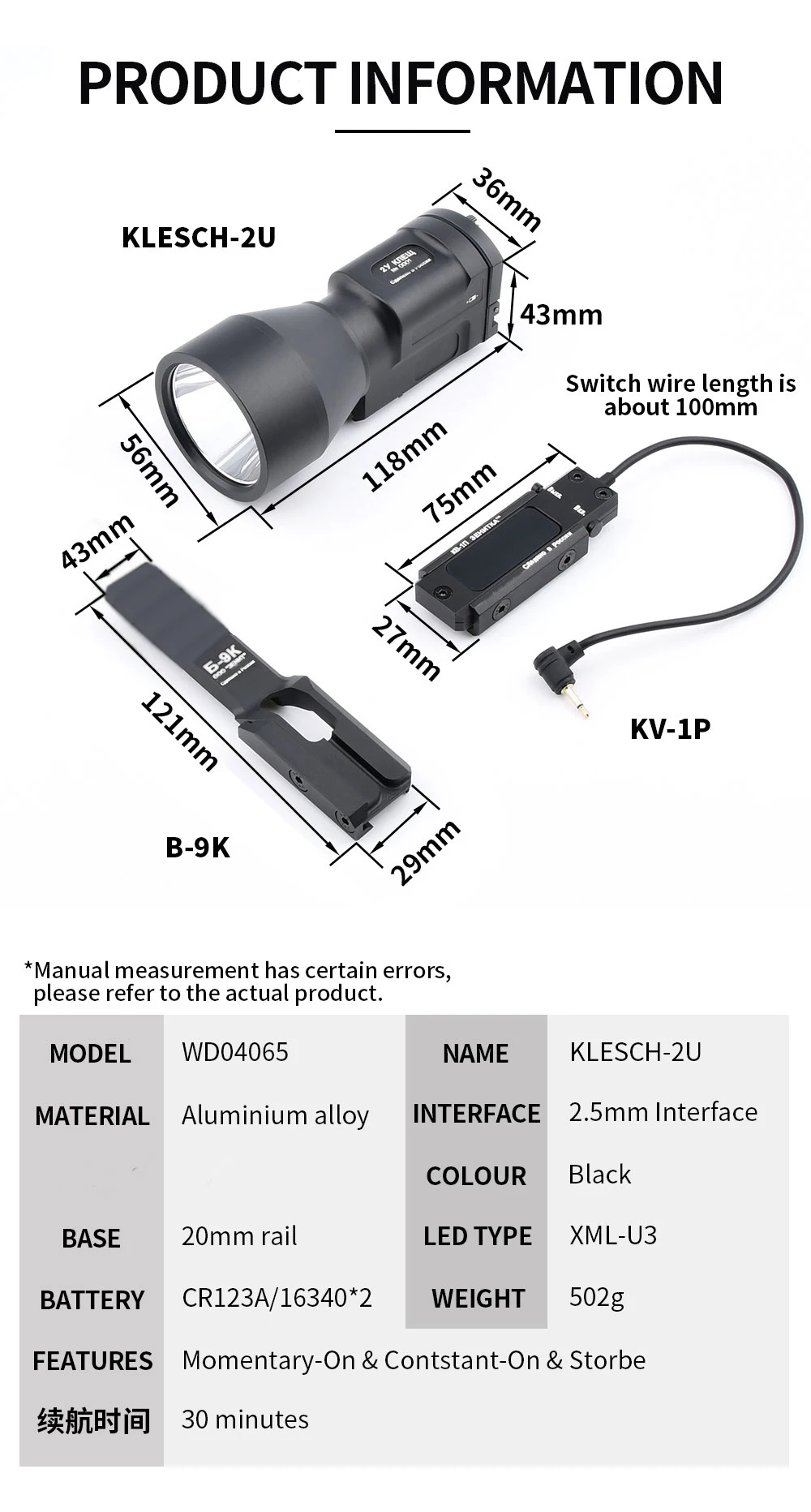 WADSN Airsoft Zenitc KLESCH-2P 2U GEN.2.0 linterna táctica armas de caza lámpara de explorador luz LED blanca o riel AK Picatinnny