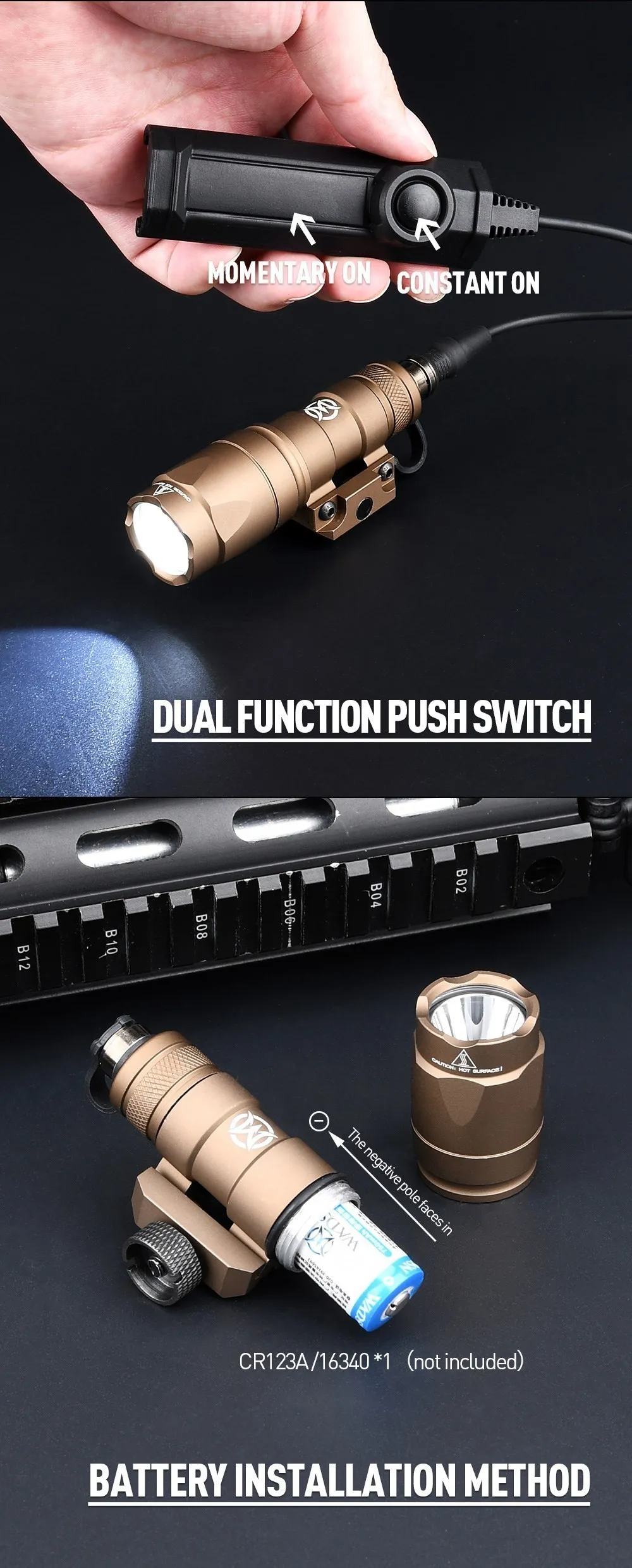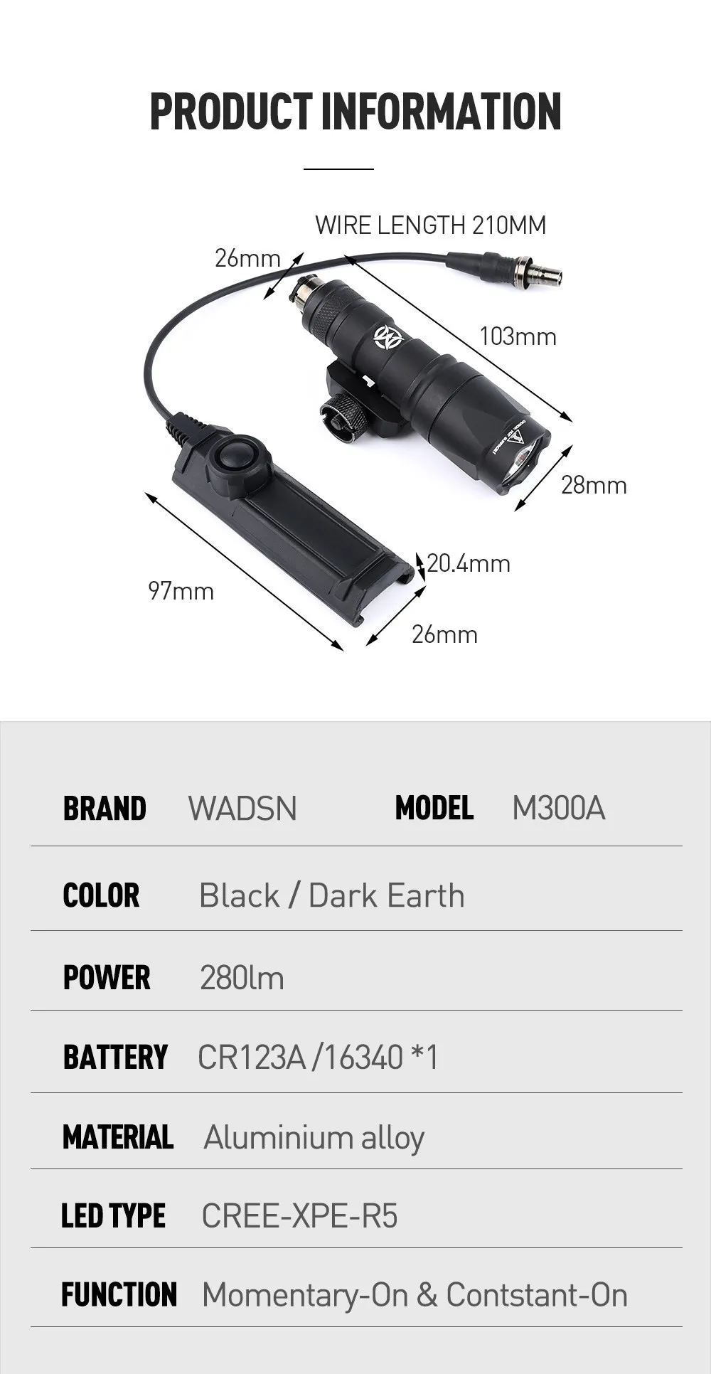 WADSN interruptor de presión de doble función para pistola Airsoft, accesorios de arma, luz de ajuste, Riel de 20mm, linterna táctica SF, M300, M300A