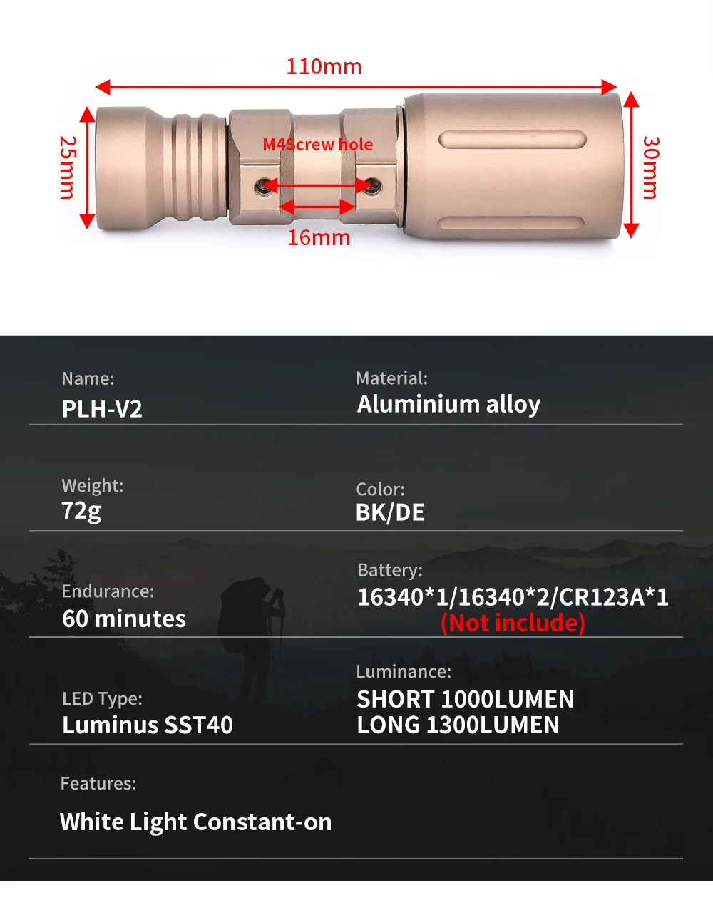 Batería: utiliza 1 Batería 16340/CR123A (no incluida).