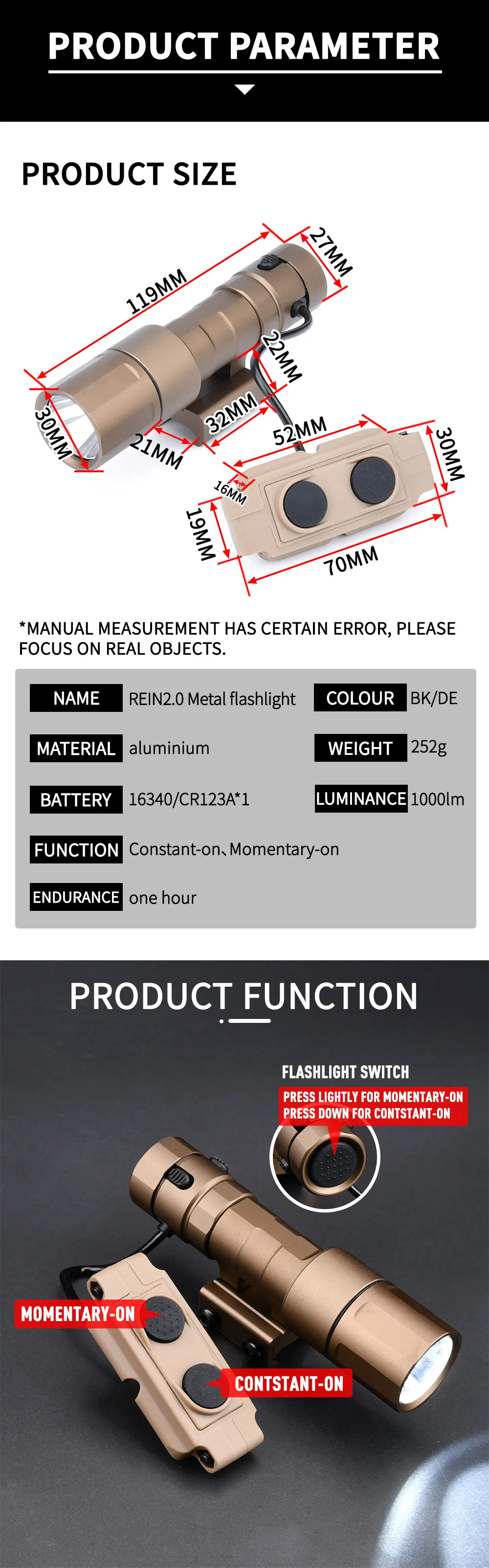 WADSN-linterna táctica de 2,0 lúmenes, luz blanca para arma de caza con interruptor de doble función, compatible con riel Picatinny de 20mm