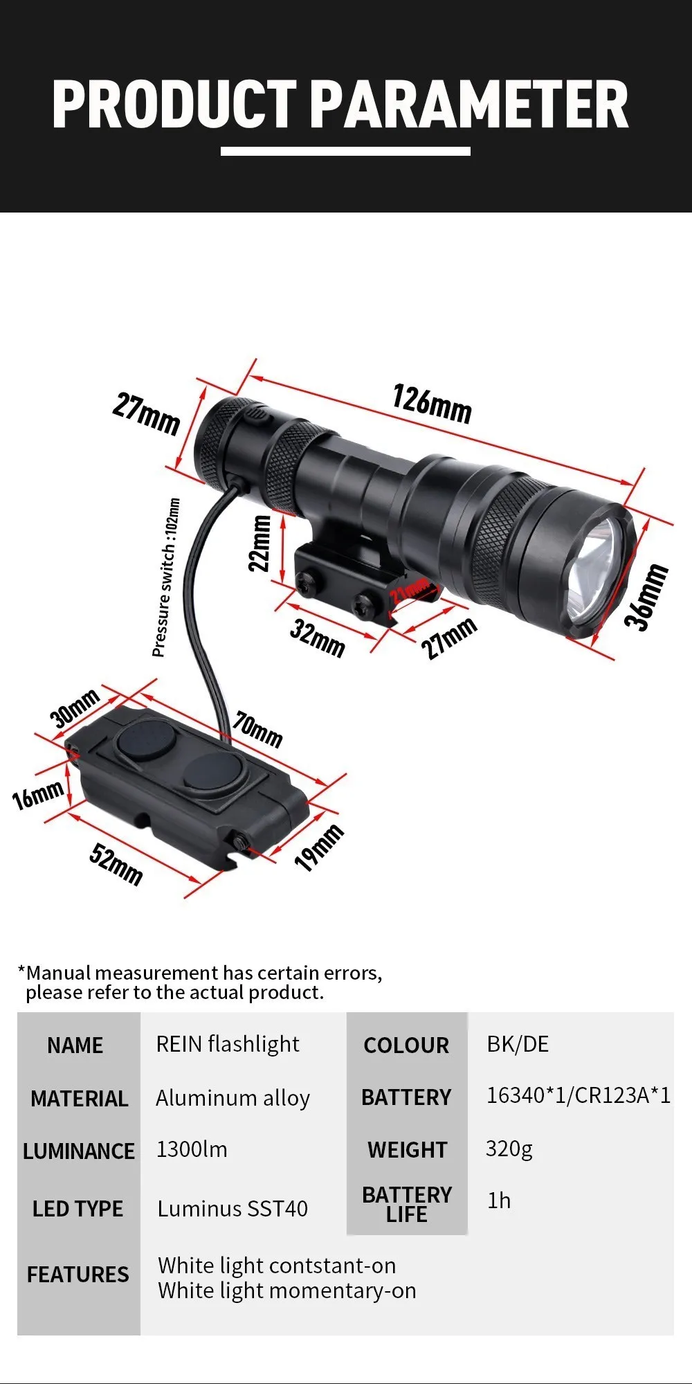 WADSN Defensa REIN Linterna Táctica 1000Lumen Arma Luz Airsoft Scout Luz AR15 Rifle Caza Luz Para Picatinny Rail