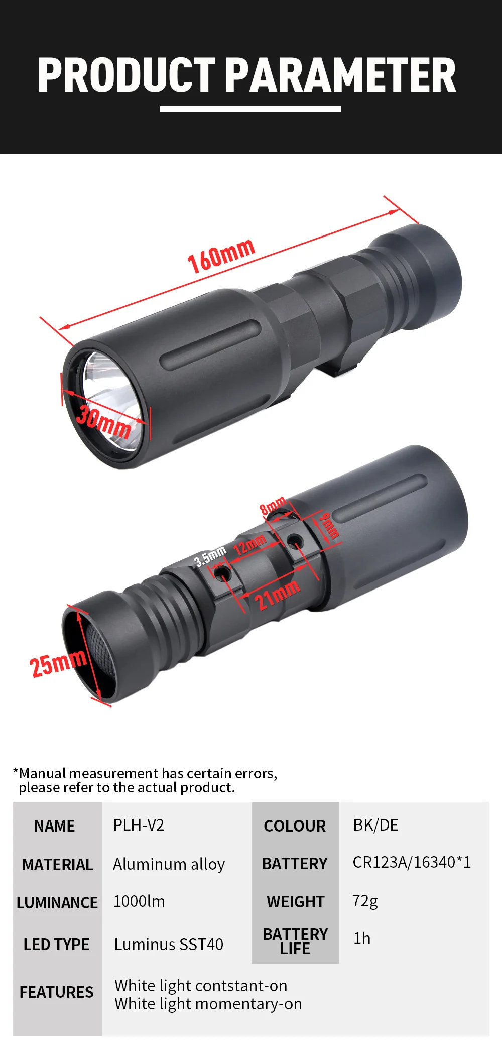 WADSN linterna táctica Plhv2 18650 LED de alta potencia 1000LM Airsoft arma de caza luz de explorador con interruptor de presión ModbuttonPEQ