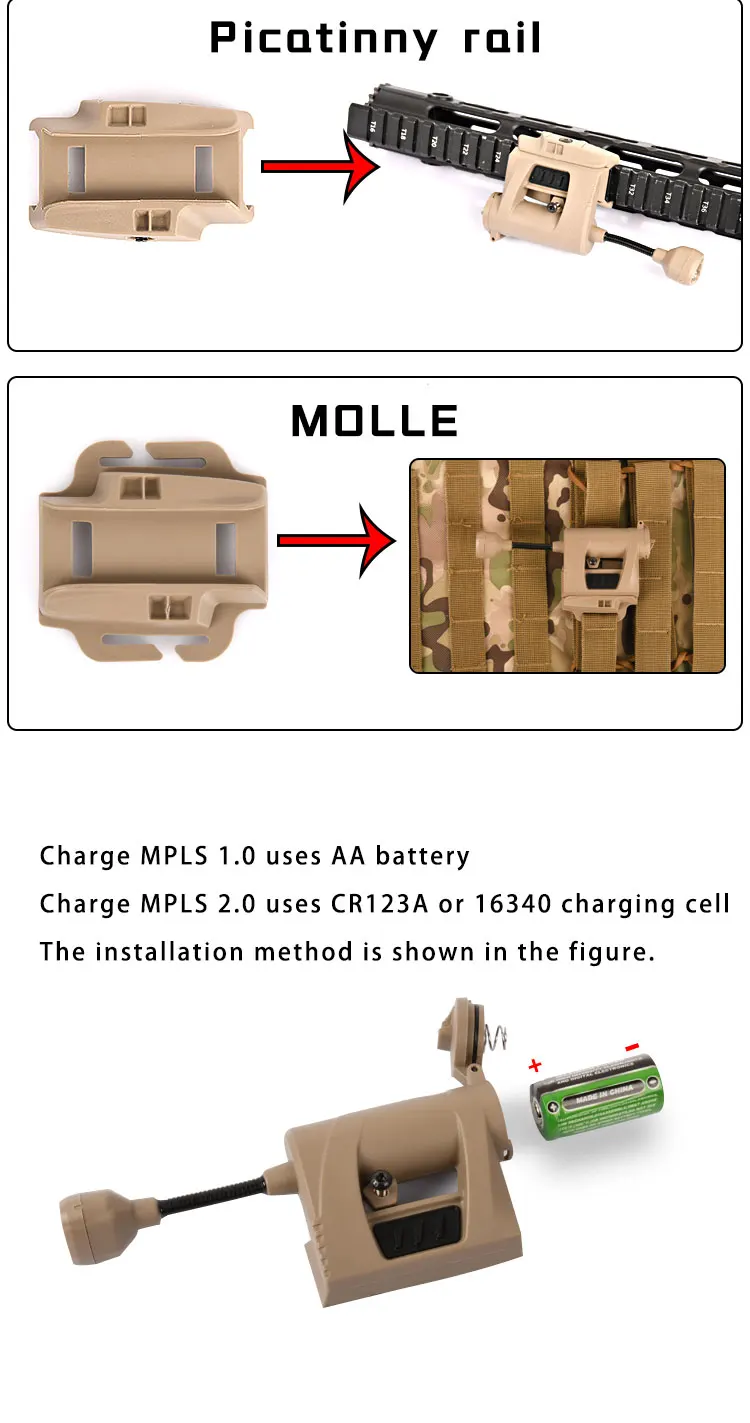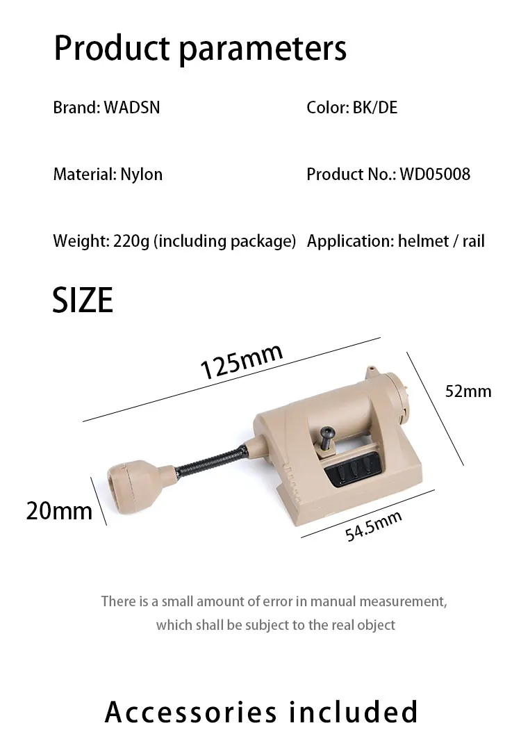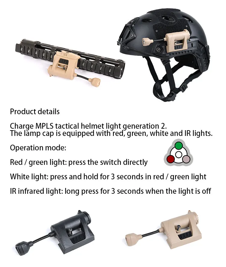 La luz táctica para casco WADSN MPLS CHARGE FAST está diseñada para uso militar y en exteriores, proporcionando una fuente de luz duradera y confiable.