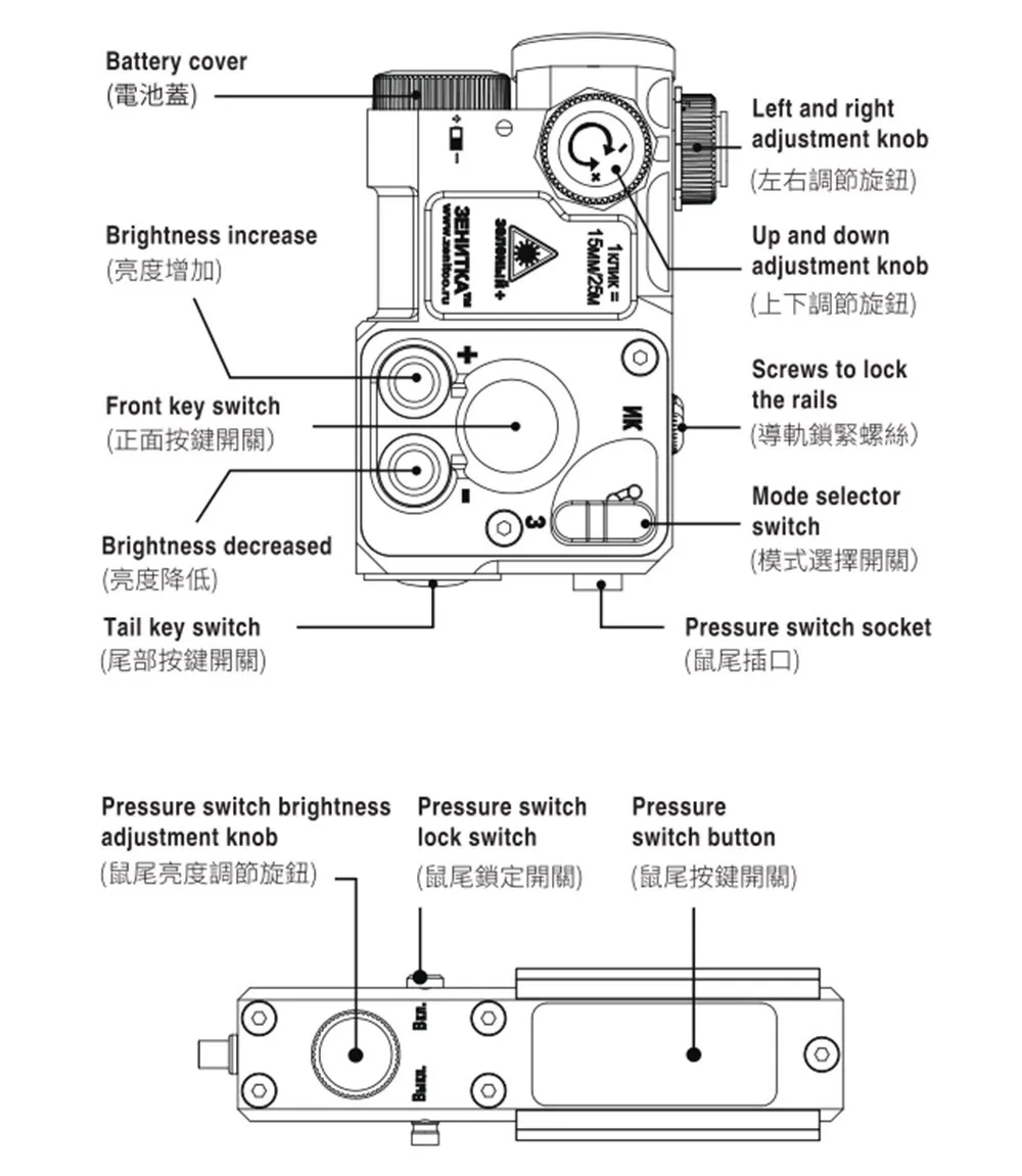 5.Two small circular buttons on the main unit to adjuest the laser brightness