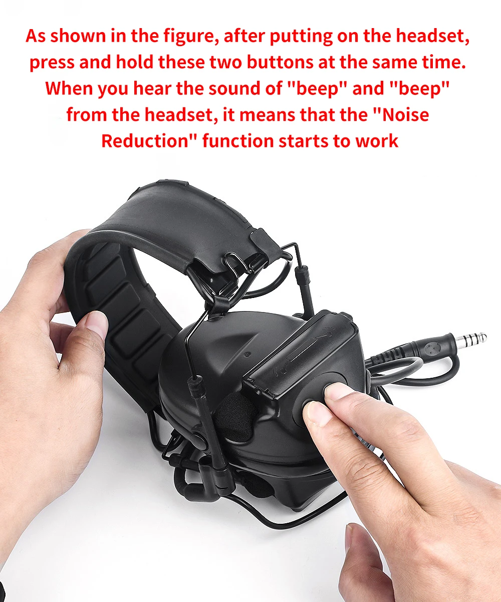 Nota: Como se muestra en la figura, después de poner el auricular, presione y mantenga presionados estos dos botones al mismo tiempo. Cuando escucha el sonido de "bip" y "bip" del auricular, significa que la función de "reducción de ruido" comienza a funcionar