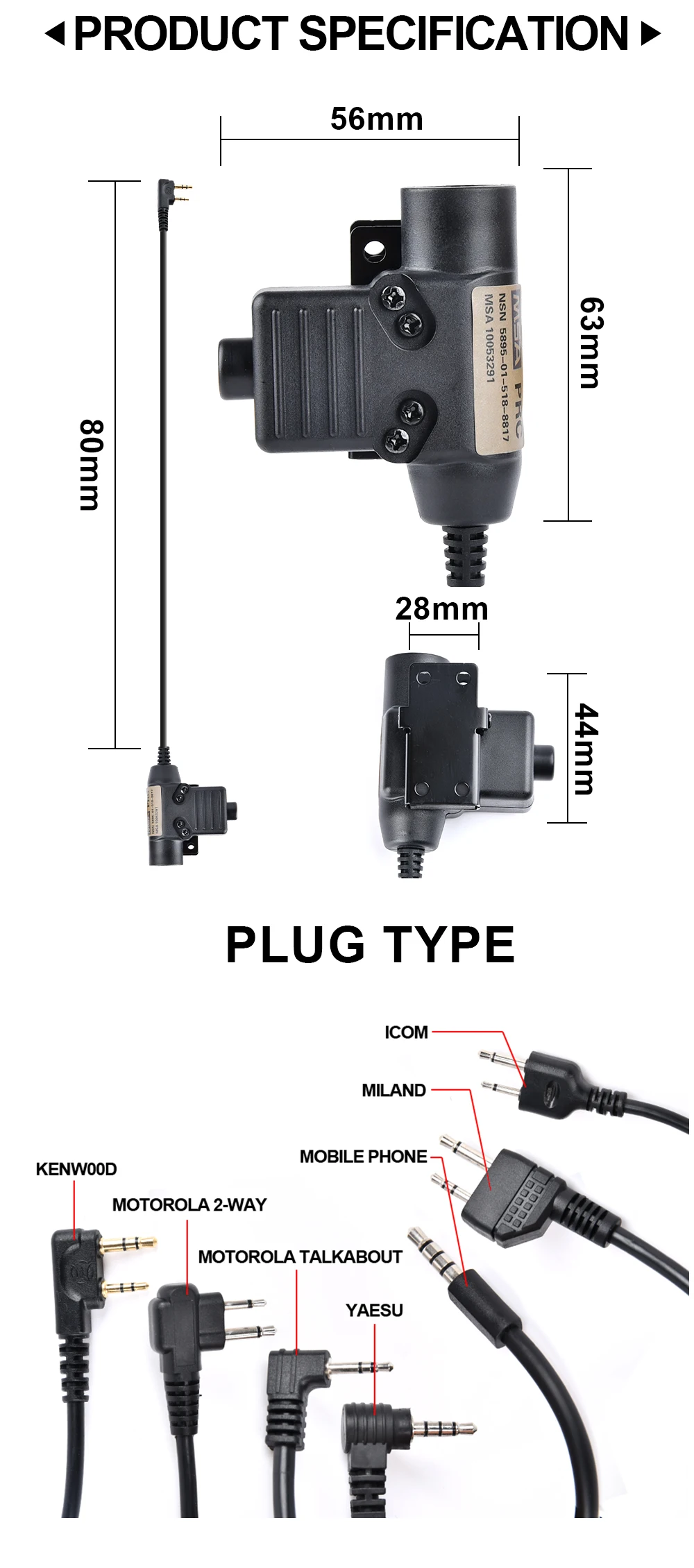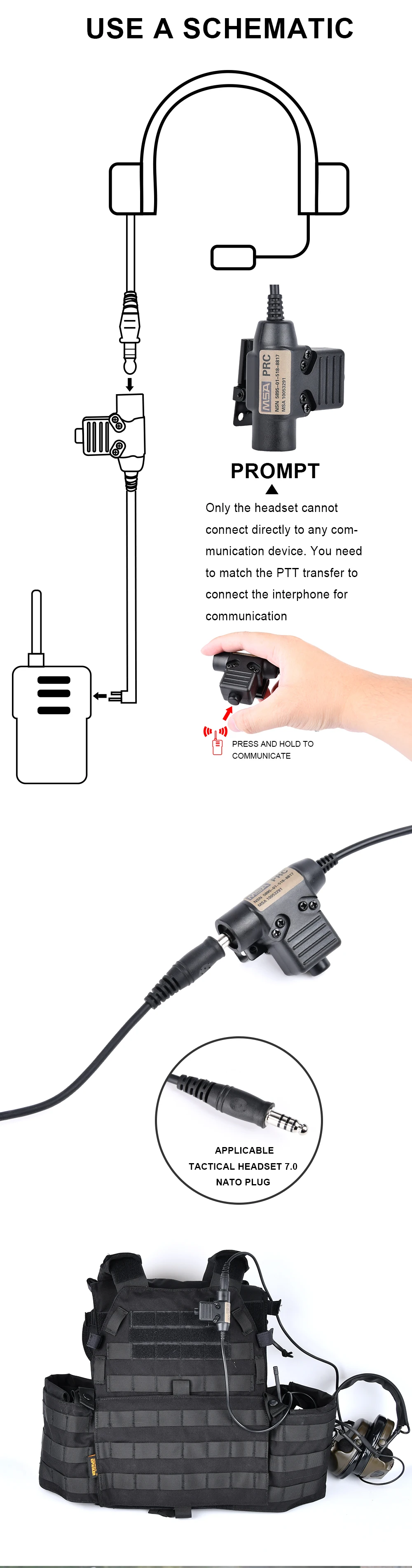 WADSN táctico militar U94 PTT 7,0 enchufe adaptador de auriculares para COMTAC Earmor Baofeng Kenwood Walkie Talkie Radio Motorola Midland