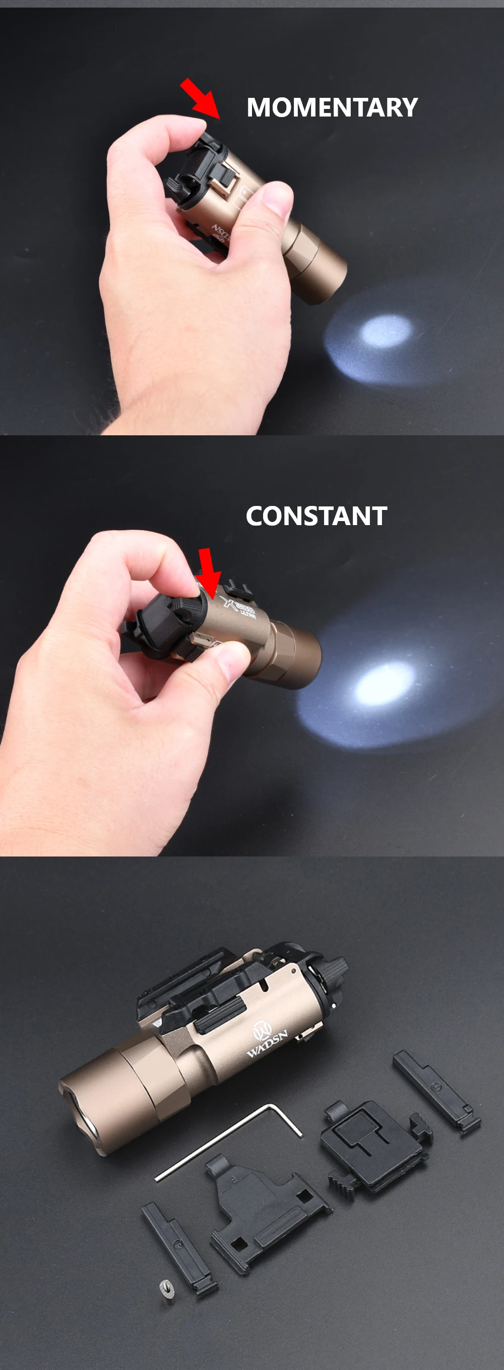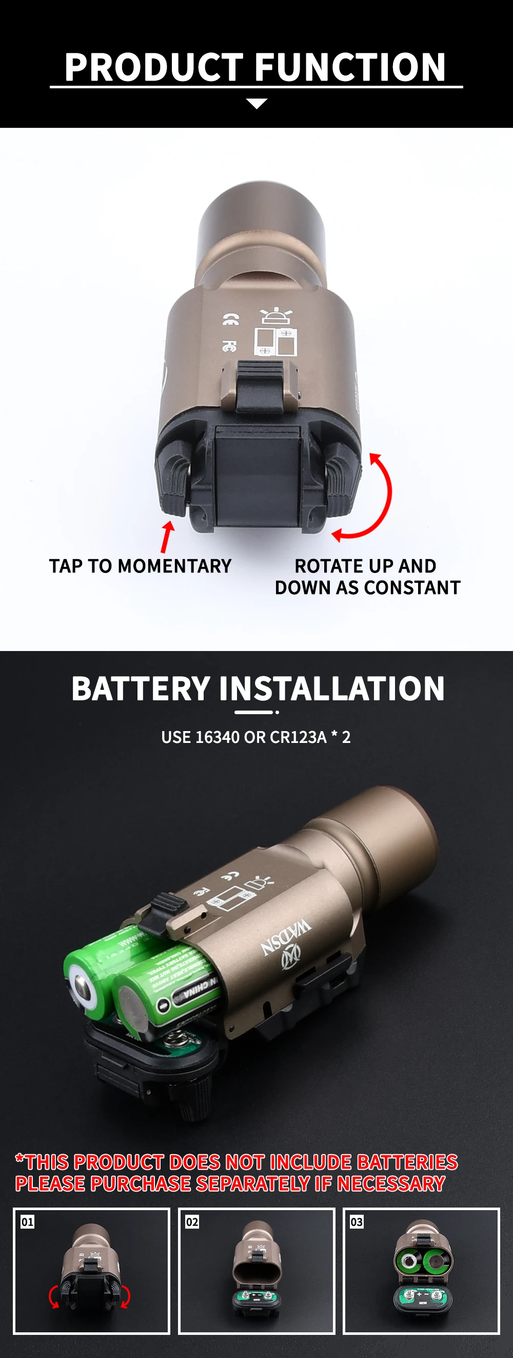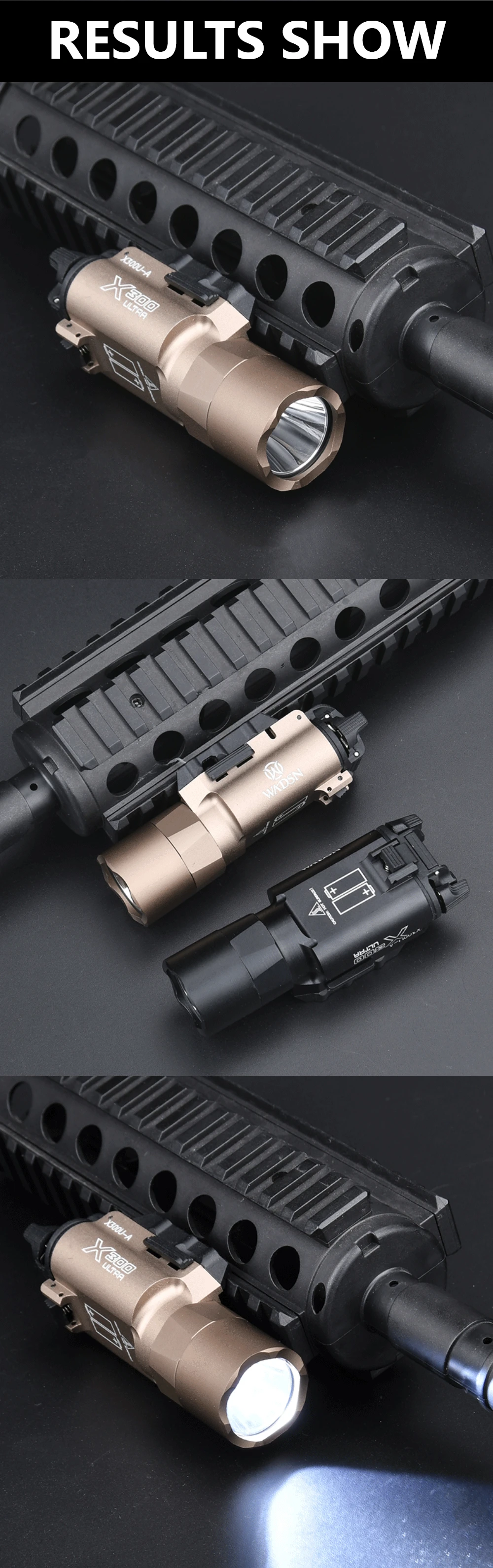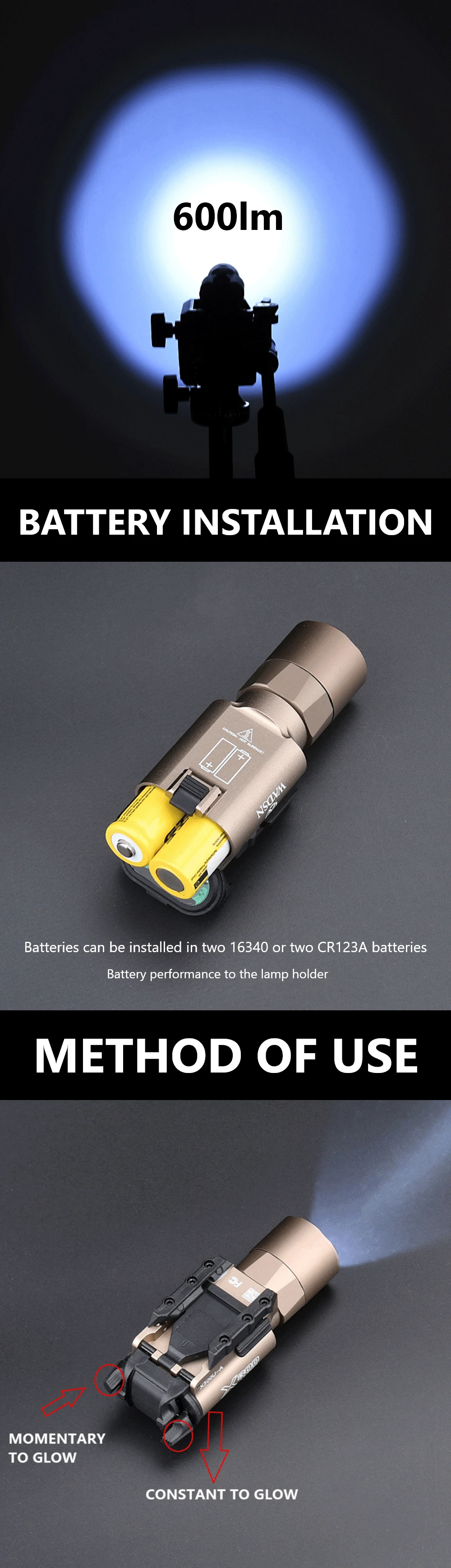 Excelente. Viene con soportes picatinny y universales. Toma pilas CR123. Sin luz estroboscópica. Muy brillante.