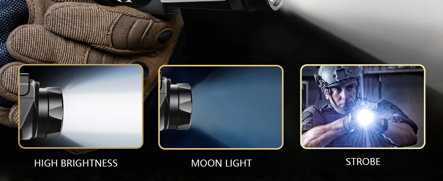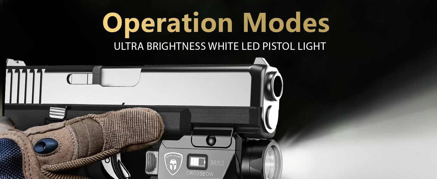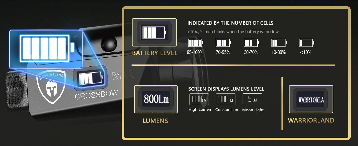 La primera luz de arma de pantalla en el mercado: WARRIORLAND CROSSBOW MA2 es una luz de arma de montaje en riel universal. La pantalla puede mostrar el estado de la batería y el modo de luz actual, lo que significa que sabe exactamente cuánta energía queda y qué modo se selecciona incluso en entornos oscuros y prepárese para cualquier situación.