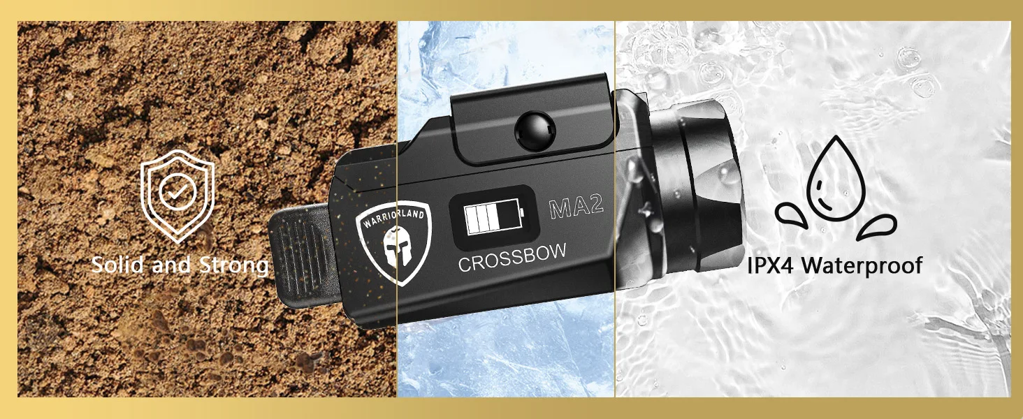 Sólido y preciso: todo el cuerpo de la luz de pistola de montaje en riel WARRIORLAND CROSSBOW MA2 está construido con aluminio anodizado y mecanizado, lo que significa que la carcasa es fuerte y duradera para soportar la prueba del tiempo.