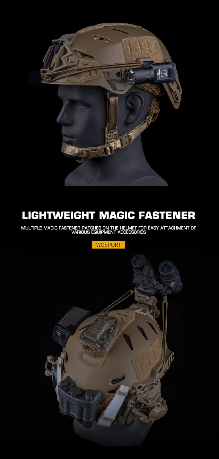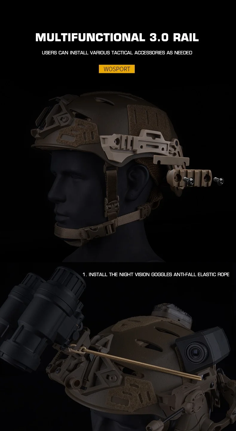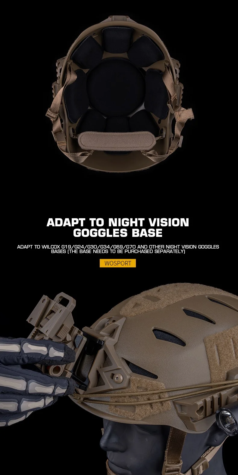 el casco se ve un plástico muy duradero, viene con sus almohadillas y unos ganchos que van acoplados a los costados del casco para sostener unas gafas de visión nocturna, se siente cómodo y muy ajustado