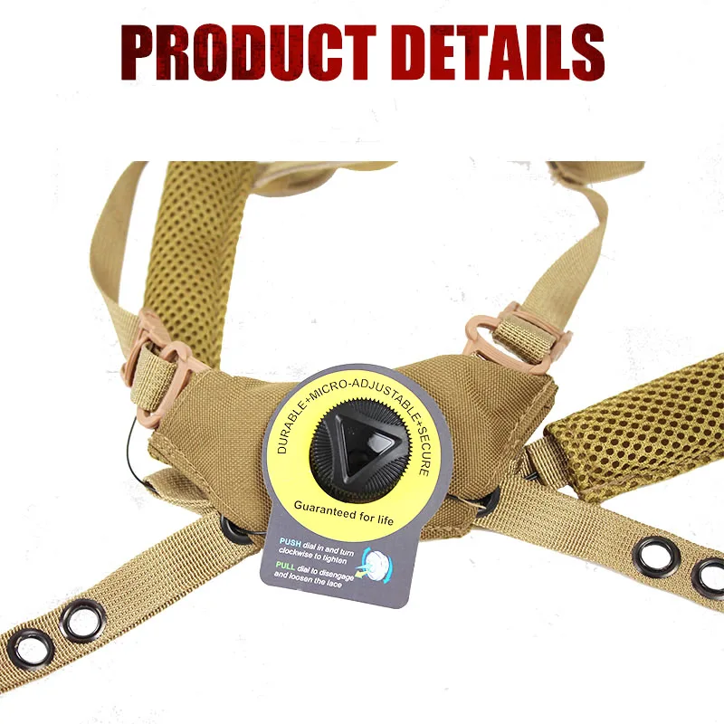 LA CALIDAD ES 100% A ESTRENAR GARANTIZADAArtículo: Sistema de suspensión de casco WendyColor: Negro. Barro. Verde militarMaterial: Nylon + CoriumPeso: aproximadamente 60gEl casco no está incluidoEl paquete incluye: 1 eslinga para casco de 1/2 ".