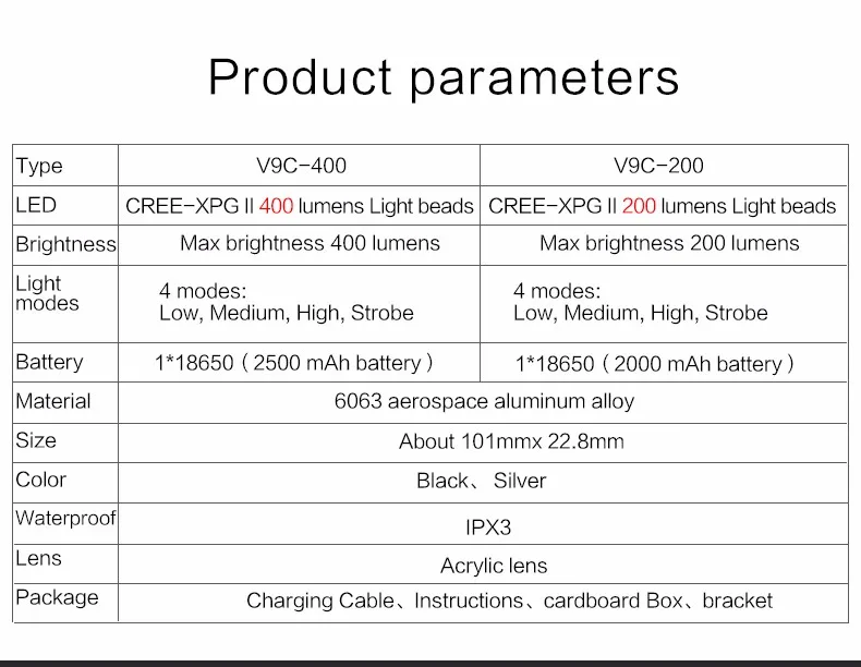 5. Batería de 2500mAh recargable por USB, para V9C400, 2000mAh para V9C200, clip de manillar