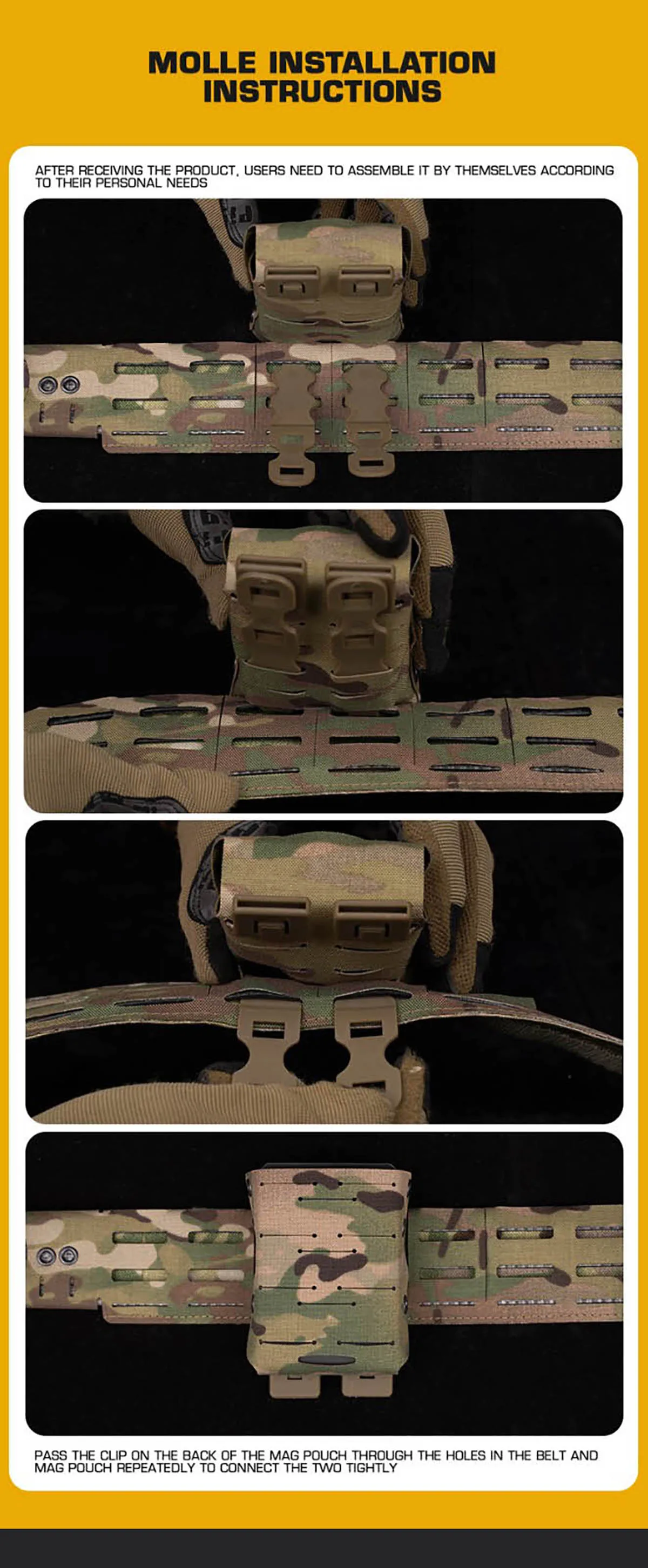 Compatibilidad MOLLE universal y fácil instalación: la parte posterior de la bolsa está equipada con un clip MOLLE exclusivo.Esto permite montarlo de forma fácil y segura en una amplia variedad de correas MOLLE/PALS.Como se muestra en las instrucciones, la instalación es sencilla: pase el clip a través de los orificios de las correas repetidamente para una conexión firme y sólida a su equipo.